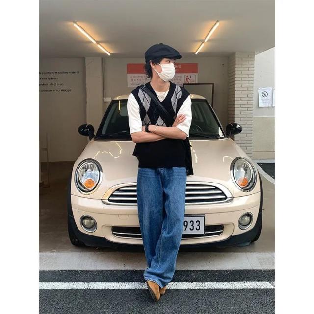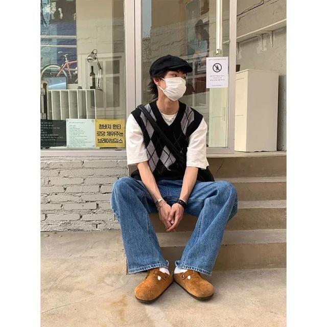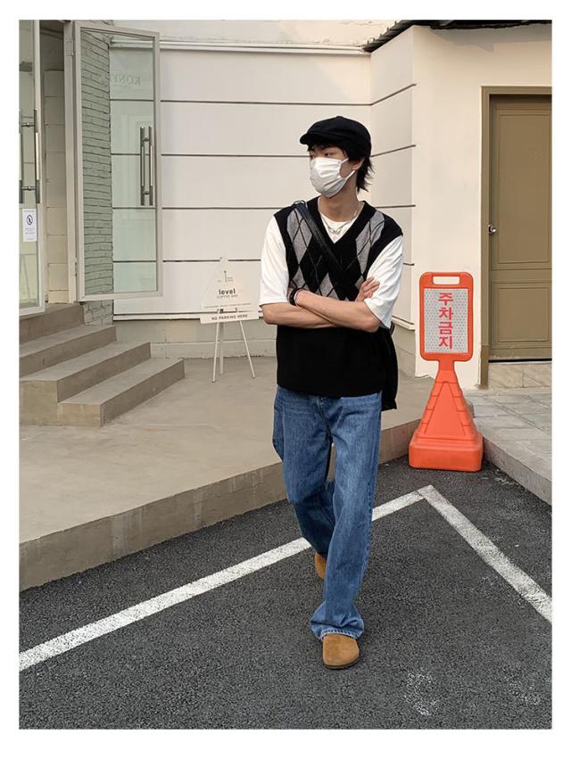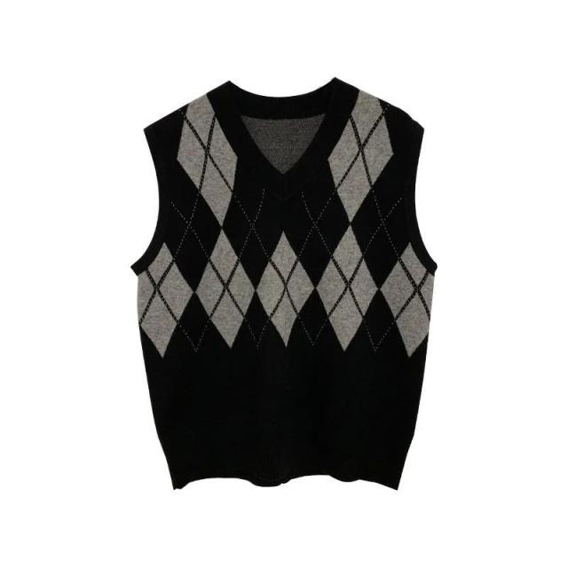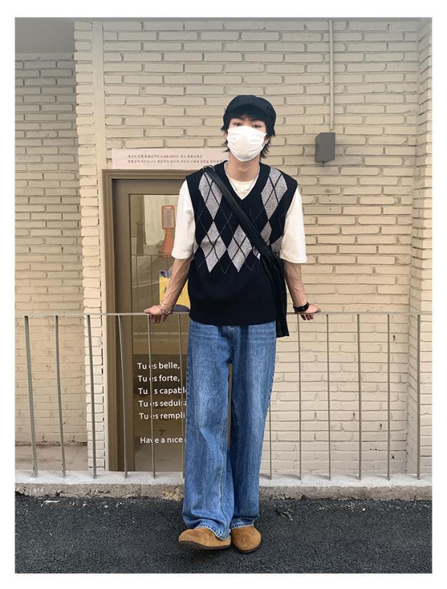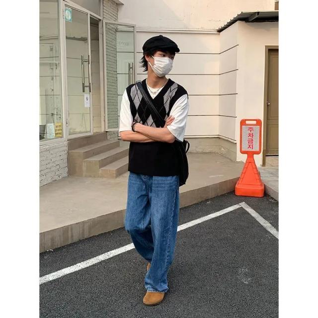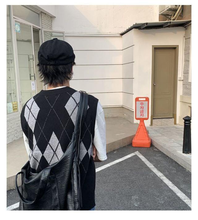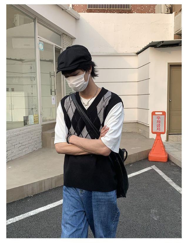 ニットベスト メンズ Vネック セーター チェック柄 菱形 トップス 袖なしセーター 大きいサイズ 厚手 秋冬 きれいめ おしゃれ 韓国 ゆったり 重ね着
