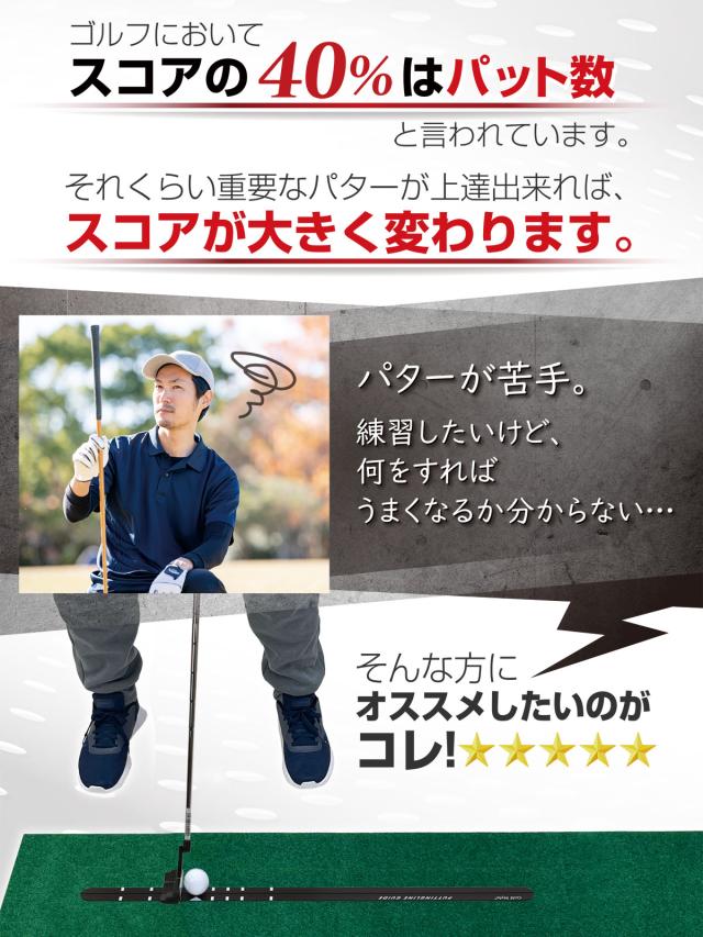 【パターはスコアの40%を占めます】ゴルフにおいてスコアの40パーセントはパット数と言われています。パターが上達出来ればスコアが大きく変わりますが、何をすれば良いかうまくなるか分からない。そんなときにオススメしたいのがパター練習レールになります。
