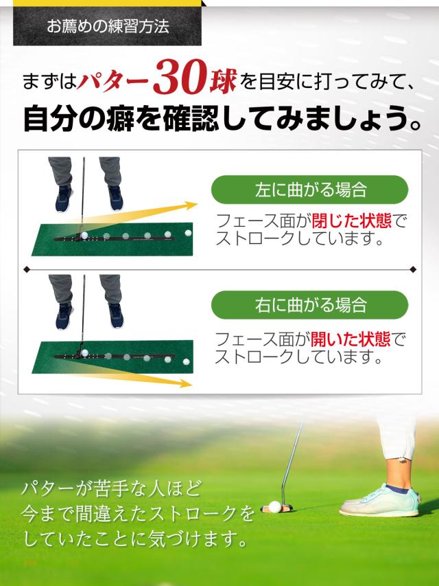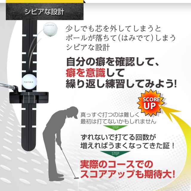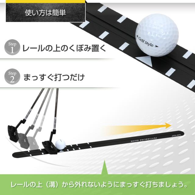 【レールの上で打つと癖に気付く】使い方は簡単で、レールの上にボールを置いて打つだけ。シビアな設計になっているため最初はまっすぐ打てないかもしれません。繰り返し練習をして連続でまっすぐ打てるようになった頃にはコースでのスコアアップも期待できるようになっています。