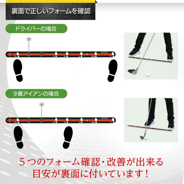 【裏面には5つのスタンスの目安付き】スタンスは広すぎても狭すぎてもよくありません。目安を基に足一つ分ずつ調整し、自分に合ったスタンス幅を見つけることで、飛距離のアップやショットの安定性に繋がります。