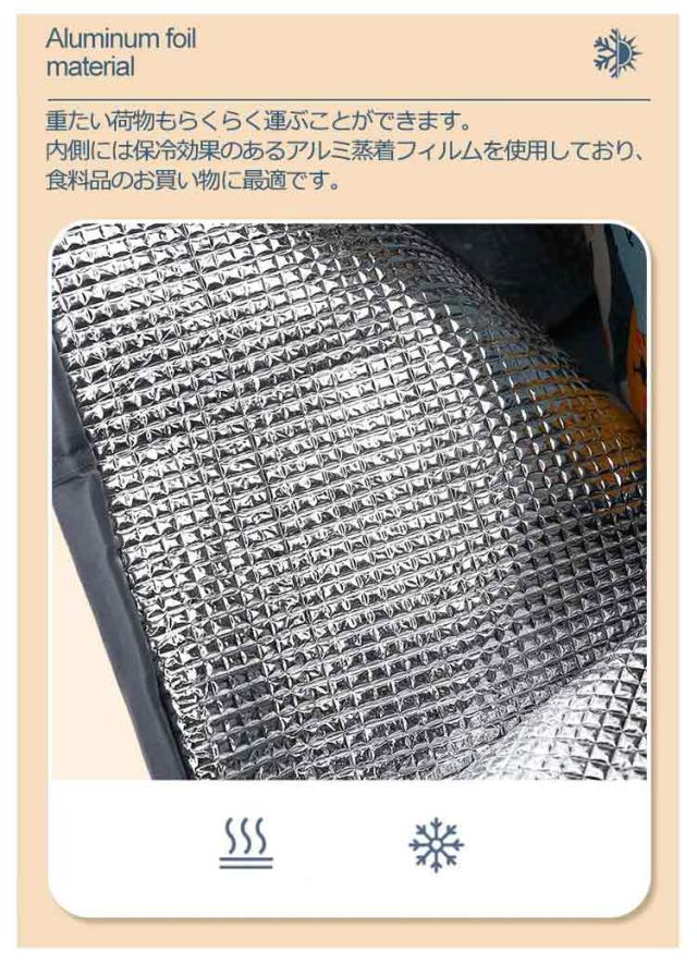 | お買い物に便利なショッピングカートです。【30L】【保冷?保温機能付き】【4輪?横押し可能】 重たい荷物もらくらく運ぶことができます。内側には保冷効果のあるアルミ蒸着フィルムを使用しており、食料品のお買い物に最適です。 撥水加工をしておりますので急な雨でも安心。 容量30Lでしっかり入り自立型で物の出し入れもしやすい。収納部の巾着部分が大きく、収納量はたっぷり コンパクト&スマートな折り畳めるショッピングカート。日常のお買い物、ランドリー、スーパーの駐車場での移動等、様々なシーンで大活躍します。 | |