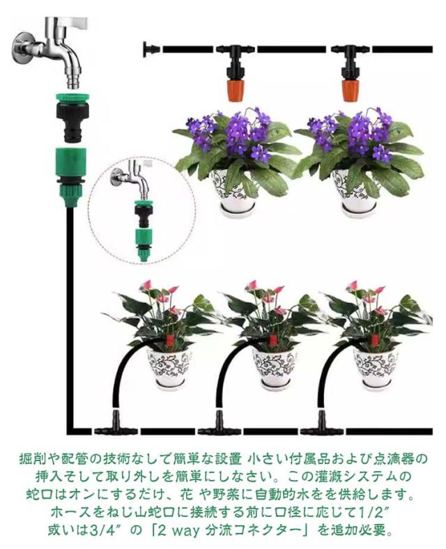 | 【高品質な材質】灌漑システムは30mのホースを付きます。精密散水システムは、耐紫外線のABS材料で作られたプロフェッショナル品質のドリップホースを使用し ています。それはどんな天候でも、一年中取り残されても、埋められても、あるいは地表にあってもよいです。 【節水】従来のスプリンクラーよりも最大70%多くの水を節約できます。精密ドリップ散水システムは、植物の根元にゆっくりと正確に適量の水をを供給します。 【簡単な使い方】掘削や配管の技術なしで簡単な設置 小さい付属品および点滴器の挿入そして取り外しを簡単にしなさい。この灌漑システムの蛇口はオンにするだけ、花 や野菜に自動的水をを供給します。ホースをねじ山蛇口に接続する前に口径に応じて1/2″或いは3/4″の「2 way 分流コネクター」を追加必要。 【広い適用】灌漑システムセットは霧化、芝生灌漑、テラス、花園、野菜灌漑、屋上冷却、灌漑、農業、野菜、温室、花壇、プール霧冷却灌漑などに適しています。汎用性 の高い灌漑システムで、庭の散水システム、優れた灌漑システムを販売しており、自動散水、自動植物散水、自動散水にも使用できます。花壇、菜園のような手の届きにくいところにも一度に水やりできます。 自動 散水タイマー 自動給水 散水用具 多肉植物 ミニ植木鉢 節水 灌漑 自動水やり器 散水機 観葉植物 自動点滴灌漑 屋内鉢植え 植物 休暇 植物散水。 【調整可能】マイクロミストノズルは、ミストのサイズを変更するために調整可能も、OFFにすることもできます。このミストシステムは一度に異なる植物の水需要を満たす ことができます。ほとんどの家庭用水圧に適しています。(1)尾の部分または散水が不要なホースには、水を無駄にしないようにギャグで塞ぐ可能。(2)黒い細いホースは、40〜60°の温水で事前に軟化され、ノズルの尾部により簡単で置けます 灌漑システム 自動散水セット 散水ホース 点滴ノズル 噴霧ノズル 点滴灌漑 花 植物 盆栽用 家庭園芸 温室加湿。 ※ご注意:本製品はお客様自身で組み立てする必要があります、継手と給水ホースの間から水漏れをする場合もございます。 ホースを蛇口に接続の場合、使用時にホースの抜け・水漏れが無いようにホースバンドや工具があると水漏れを防ぐ事ができます。 | |