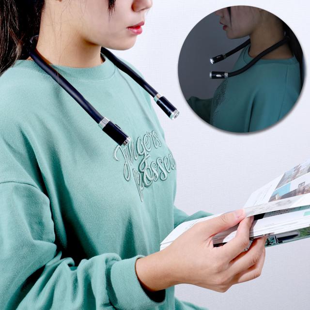 円形のネックレスタイプのネックライトとは違って、U字型の首に引っ掛けるタイプなので、LEDライトが2つ付いています。とても明るく照らしてくれるネックライトです。