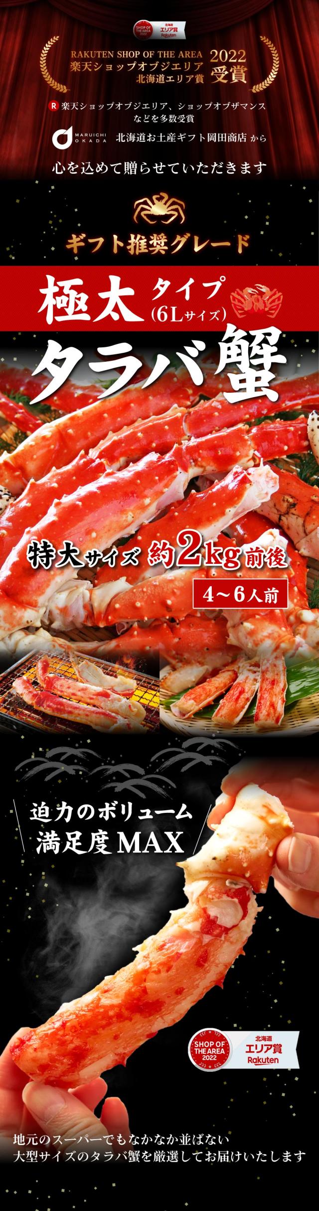 | 内容量 | タラバガニ脚 1kg前後※ × 2肩セット ※グレース(氷の膜)込みの重量になります |