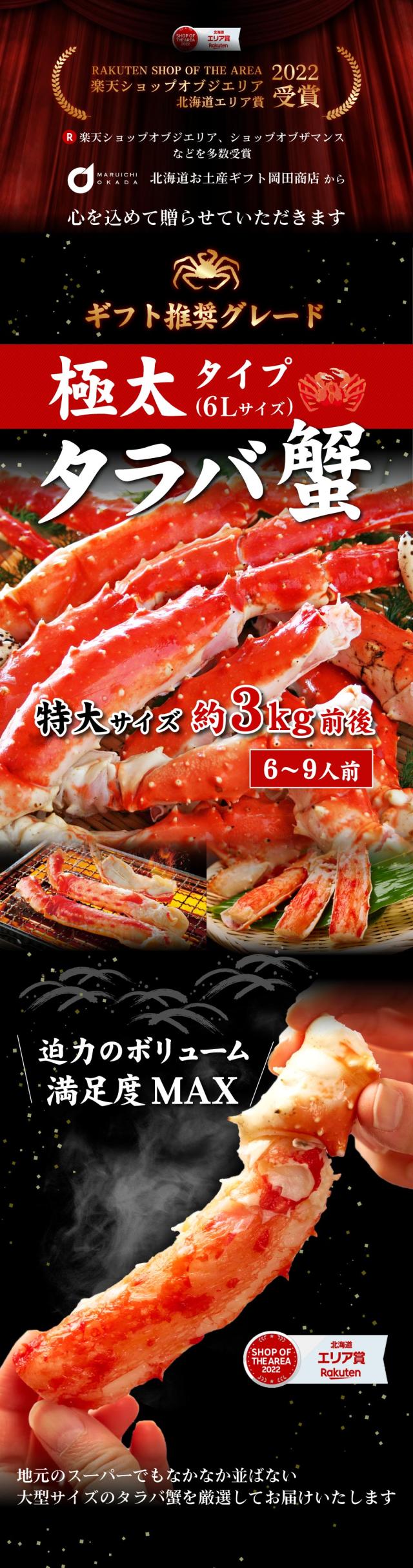 | 内容量 | タラバガニ脚 1kg前後※ × 3肩セット ※グレース(氷の膜)込みの重量になります |