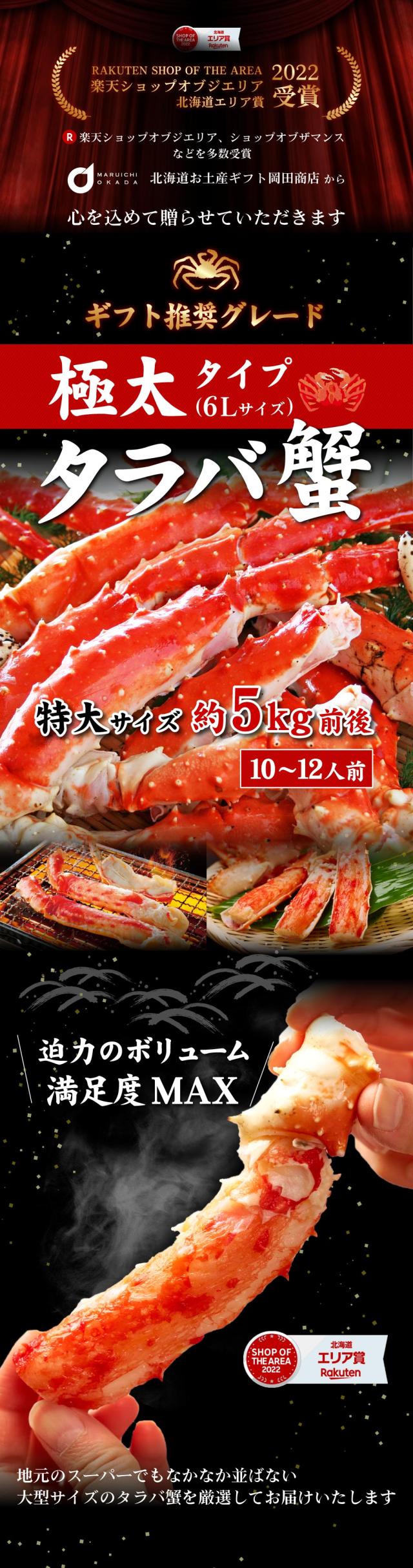 | 内容量 | タラバガニ脚 1kg前後※ × 5肩セット ※グレース(氷の膜)込みの重量になります |