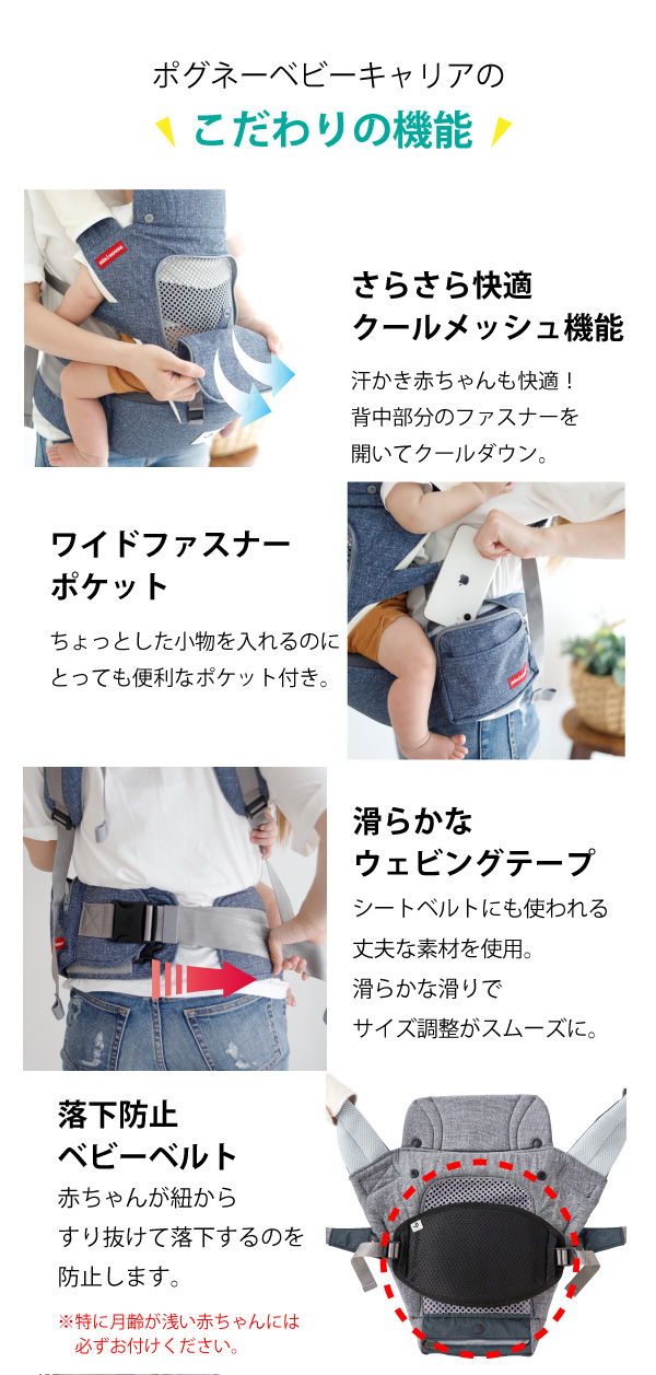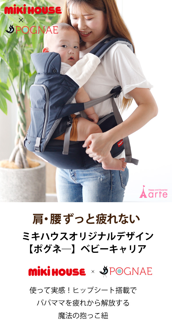 ミキハウスオリジナルデザインの【ポグネー】ベビーキャリアです。ポグネーヒップシートキャリアは、腰ベルトに赤ちゃんを座らせるヒップシート(台座)の椅子が付いている抱っこ紐です。