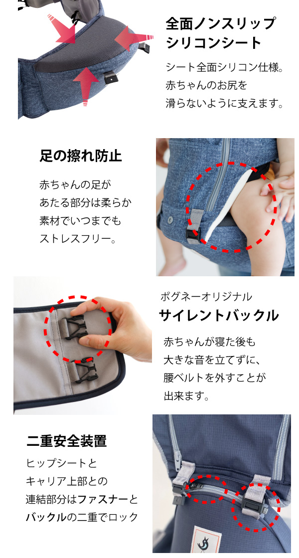 ・腰ベルトにサイレントバックルを使用しているので、赤ちゃんが寝てしまっても安心して着脱できます