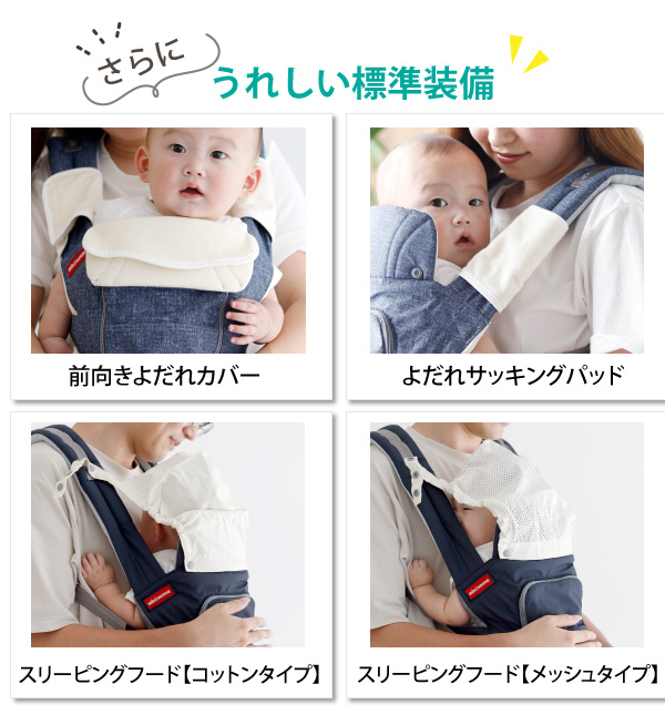 | セット内容 | ・ヒップシートキャリア本体 ・落下防止シート ・よだれパット ・前向きよだれパット ・スリーピングフード2種 ・取り扱い説明書(保証書付き) ・トートバッグ |