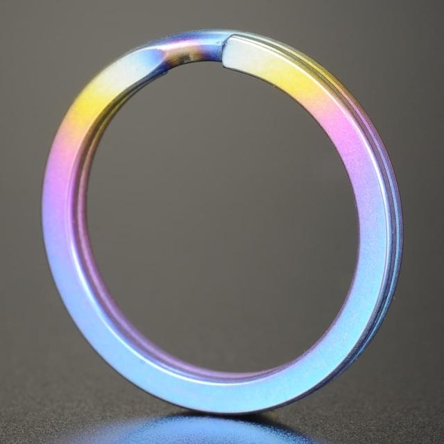 強度、耐熱性、耐食性に優れるチタンを使用した二重リングです。つや消し仕様のレインボーメッキが使われており個性的な色合いが目を引きます。キーリングや各種ハンドクラフト用のパーツとしてご活用ください。ワイヤーをフラットにした平角仕様のため刻印なども施しやすくなっています。
