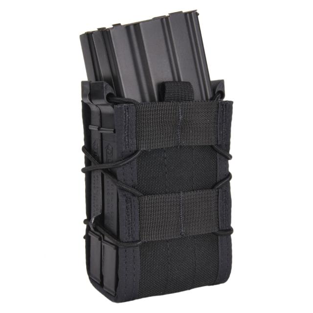 フロント/バックのコーデュラナイロン生地と、両サイドのポリマー製ガイドパーツを伸縮性のあるバンジーコードで編み込む独自構造により、どんなマガジンでも最適なフィット感にセッティング。