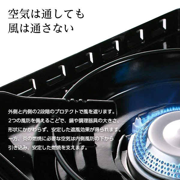 『カセットフー タフまる』の特徴風は通さず、燃焼に必要な空気は取り入れる、「ダブル風防ユニット」を搭載。風によって炎が横倒しになることを防ぐので、安定した加熱が得られます。