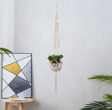 コットンロープを編み込んだマクラメの植物ハンギング。ナチュラルなアイボリー色はグリーンとの相性も抜群で、室内インテリアにもしっくり溶け込んでくれそう。