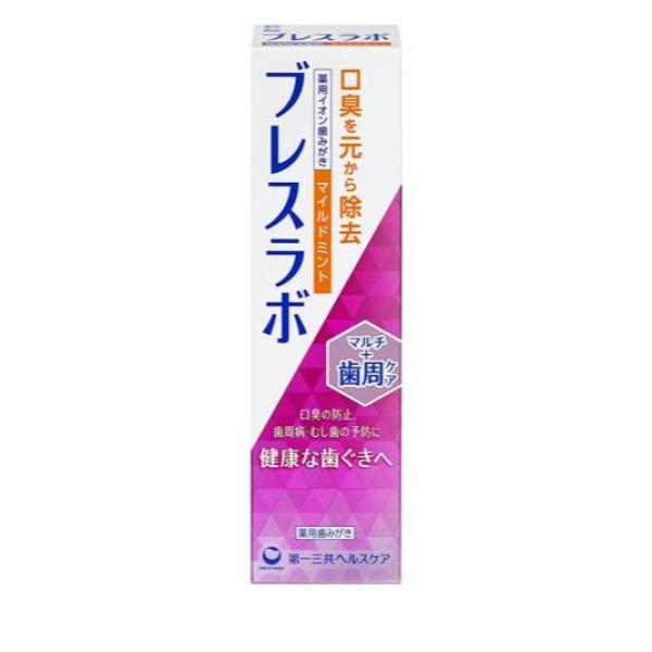●薬用イオン歯みがき『ブレスラボ マルチ+歯周ケア』マイルドミント●歯周ポケットの奥の口臭も元から除去●2大口臭(※1)を原因から除去する口臭予防歯みがきです。●6種の薬用成分を配合。歯周病(※2)ケア成分(グリチルリチン酸ジカリウム)の配合量が最高濃度です(ブレスラボシリーズ内)。●口臭の原因となる歯周病やむし歯も予防。●独自処方KCS(Keep Cool System)を採用。清涼感が持続します。●刺激の少ないマイルドミントのフレーバーです。●販売名:DS薬用イオン歯磨きPP2※1:口中が原因の生理的口臭と病的口臭※2:歯周病とは、歯肉炎・歯槽膿漏(歯周炎)の総称です。