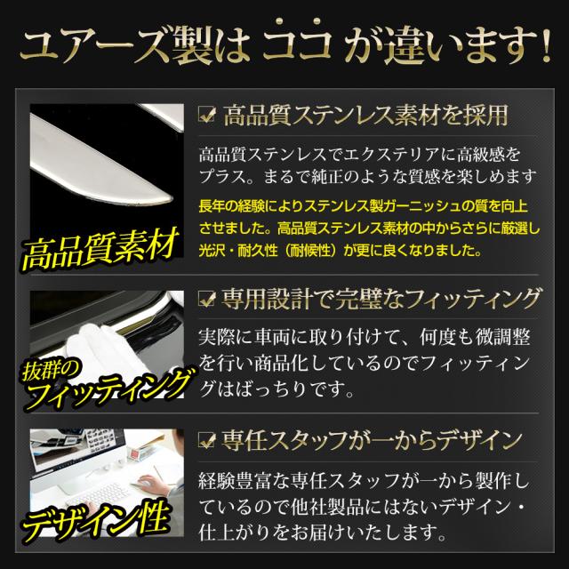 高品質なステンレス素材を使用した、純正のような深い光沢のメッキパーツが登場。 エクステリアに高級感をプラスして、ワンランク上のドレスアップを手に入れられます! 実際に車両に取り付け、何度も微調整を行い商品化しているのでフィッティングはバッチリ。 経験豊富な専任スタッフが一から制作しているので他社製品にはないデザイン・仕上がりをお届けいたします! 届いた時点で強力両面テープがメッキ裏面についておりますので、あとは取り付け箇所をしっかり脱脂して貼り付けるだけでOKです! 必要に応じて付属のマスキングテープや両面テープを使用してください。 |