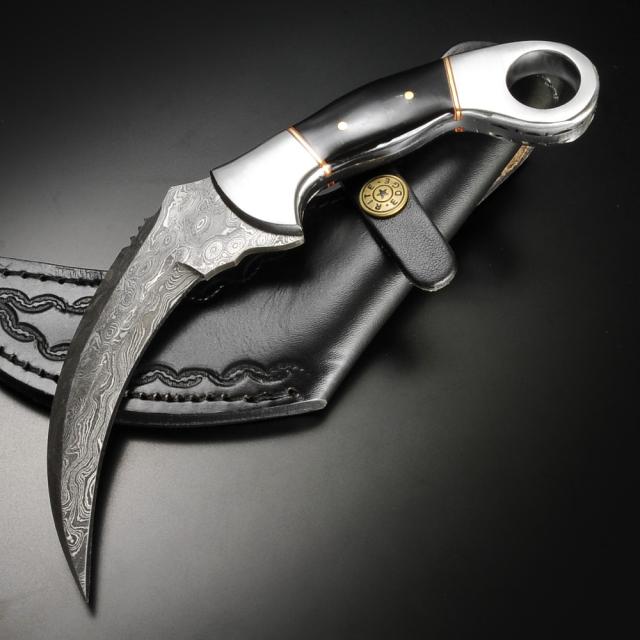 ダマスカス特有のしま模様のブレードとブラックカラーのホーンハンドルで高級感のある見た目が特徴的なカランビットです。