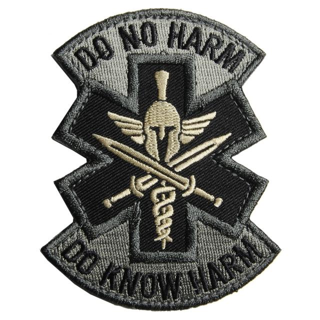 高品質なジョークパッチを提供するMIL-SPEC MONKEYの刺繍パッチ。世界中の救急医療のシンボルマークであるスター・オブ・ライフのマークを元に、「DO NO HARM」の文字と、海賊風にアレンジした古代スパルタ軍の装甲歩兵のヘッドとクロスソードが入ったデザインです。