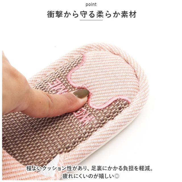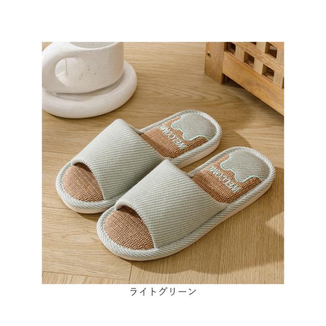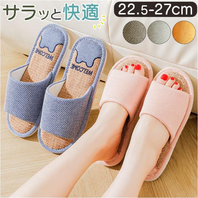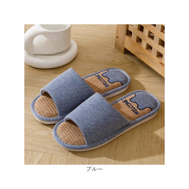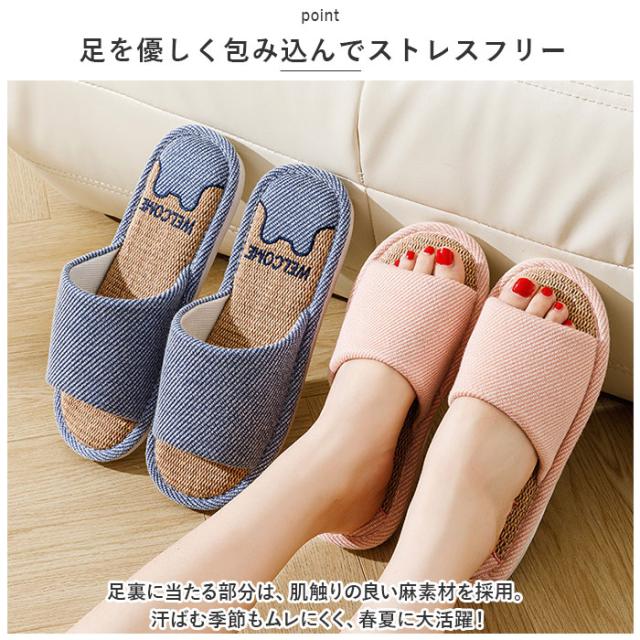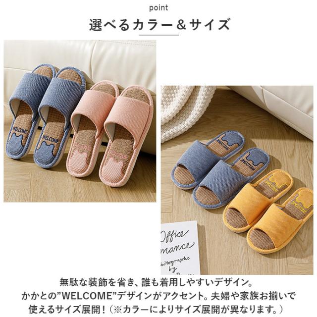 | 商品説明 | ・サラッと快適!履き心地の良い、ルームシューズが新登場。 【足を優しく包み込んでストレスフリー】 ・足裏に当たる部分は、肌触りの良い麻素材を採用。汗ばむ季節もムレにくく、春夏に大活躍! 【衝撃から守る柔らか素材】 ・程よいクッション性があり、足裏にかかる負担を軽減。疲れにくいのが嬉しい◎ 【フローリングでも安心】 ・底面は滑りにくいよう若干の凹凸加工を施したPVC素材。柔らかいのでフローリングなどを傷つけることなく、転倒などからガード。歩いた時のパタパタ音も気にならない♪ 【選べるカラー&サイズ】 ・無駄な装飾を省き、誰も着用しやすいデザイン。かかとの”WELCOME”デザインがアクセント。夫婦や家族お揃いで使えるサイズ展開!(※カラーによりサイズ展開が異なります。) |