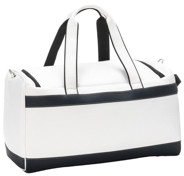 レザー調PU生地とエナメル生地を使用した高級感のあるモデル。ゴルフロッカーに立てた状態でも収納しやすいよう、側面ハンドル付き。本体外側に、ファスナーポケット2か所。開口部がコの字型になっており、出し入れしやすい設計。開口部裏側は視認性の良いメッシュ仕立てのファスナーポケット。本体内部に、ファスナーポケット、二つの仕切りポケット付き。取り外し可能なパット付きショルダーベルト付き。