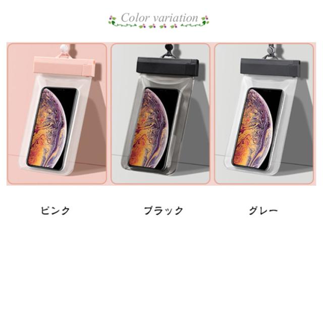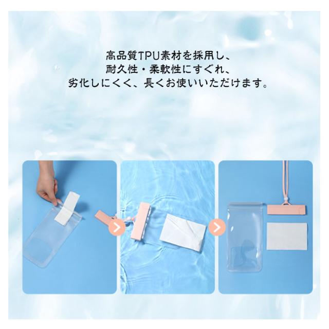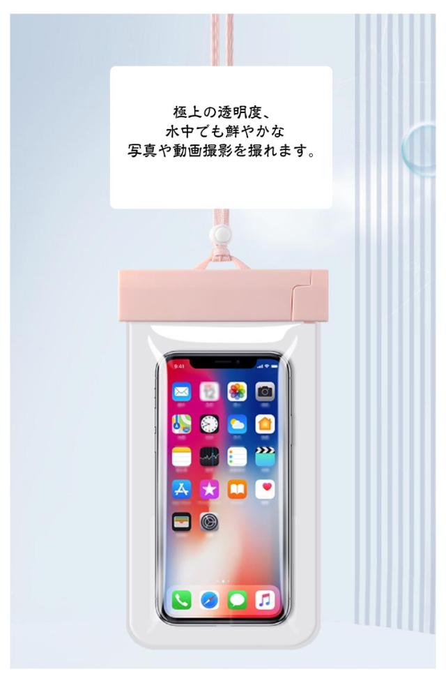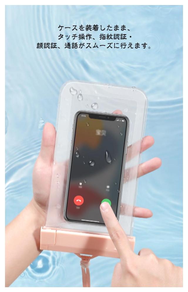 | PVC(ビニール)より透明度が高く、柔らかいTPU素材のスマホ防水ケース。 防水国際保護等級IPX8認定を獲得、水深30mで約30分間耐えられる高い防水性をほこります。 極上の透明度、水中でも鮮やかな写真や動画撮影を撮れます。 ケースを装着したまま、タッチ操作、指紋認証・顔認証、通話がスムーズに行えます。 高品質TPU素材を採用し、耐久性・柔軟性にすぐれ、劣化しにくく、長くお使いいただけます。 野外ライブ、お釣りや水泳、雪遊び、温泉/お風呂で音楽やビデオを楽しみたい時、山登り、スキー、海辺での撮影など様々な場面で大活躍。 | |