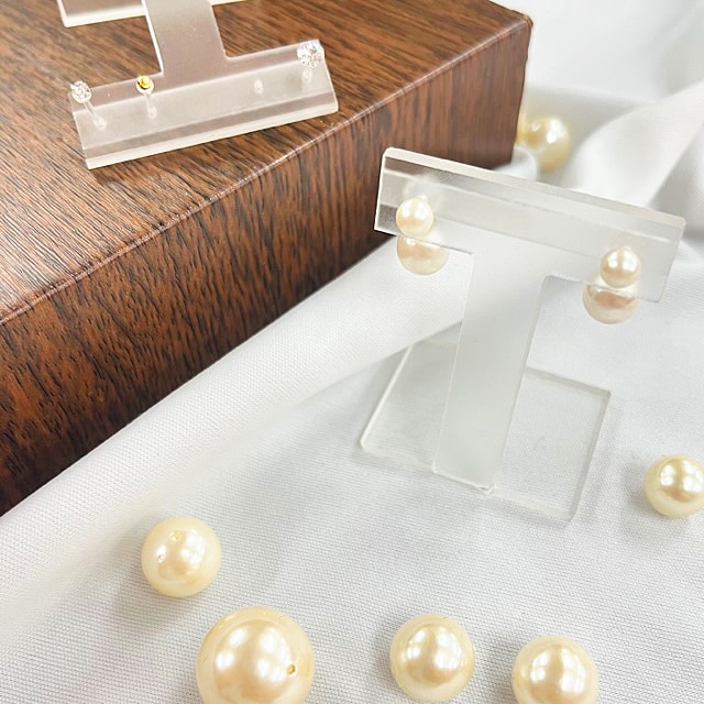 バックパールが可愛いセットピアス。キャッチに下がりパールがついているデザインです。