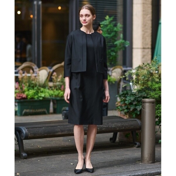 生地はオフスケール(防縮加工)したウール糸に濃染加工施し、深い黒を表現したブラックフォーマル用の素材です。
