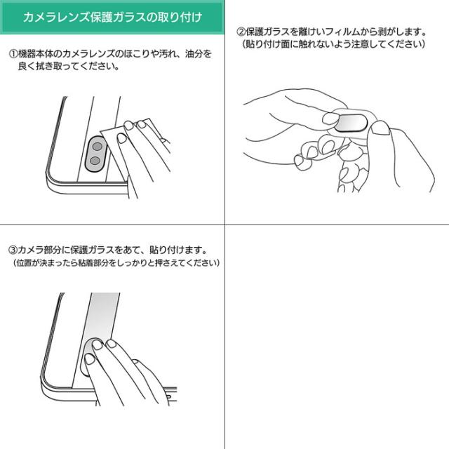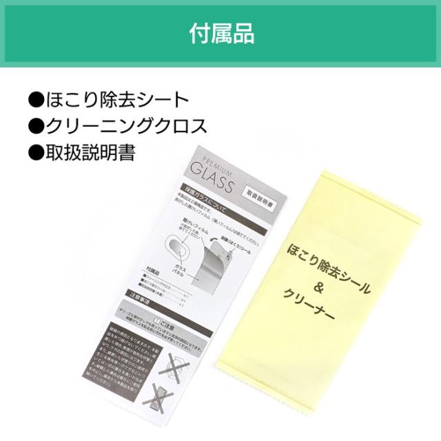 ・梱包内容:ディスプレイ保護ガラス×1、カメラレンズ保護ガラス×1、クリーニングクロス×1、ほこり取りシール×1、取扱説明書×1。