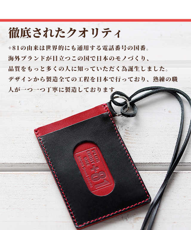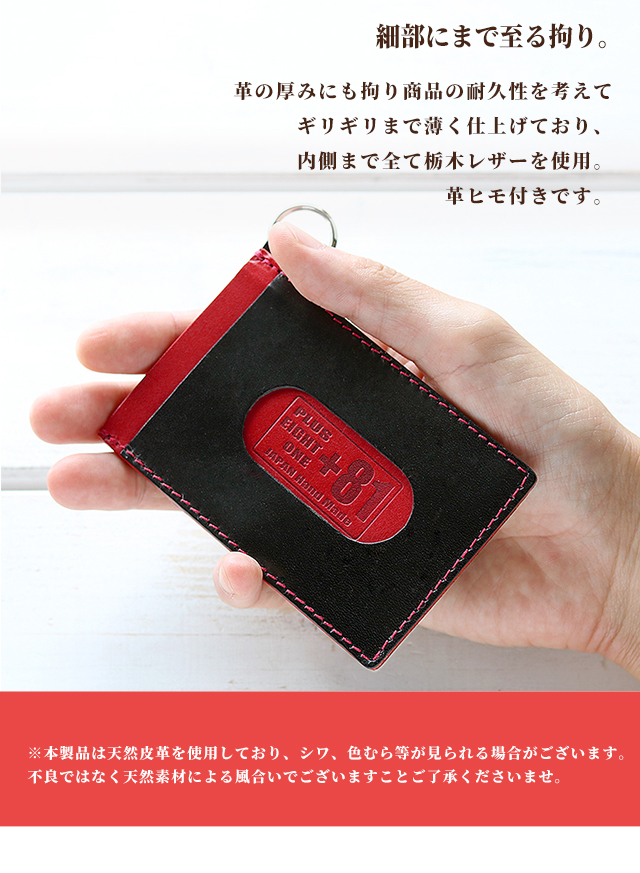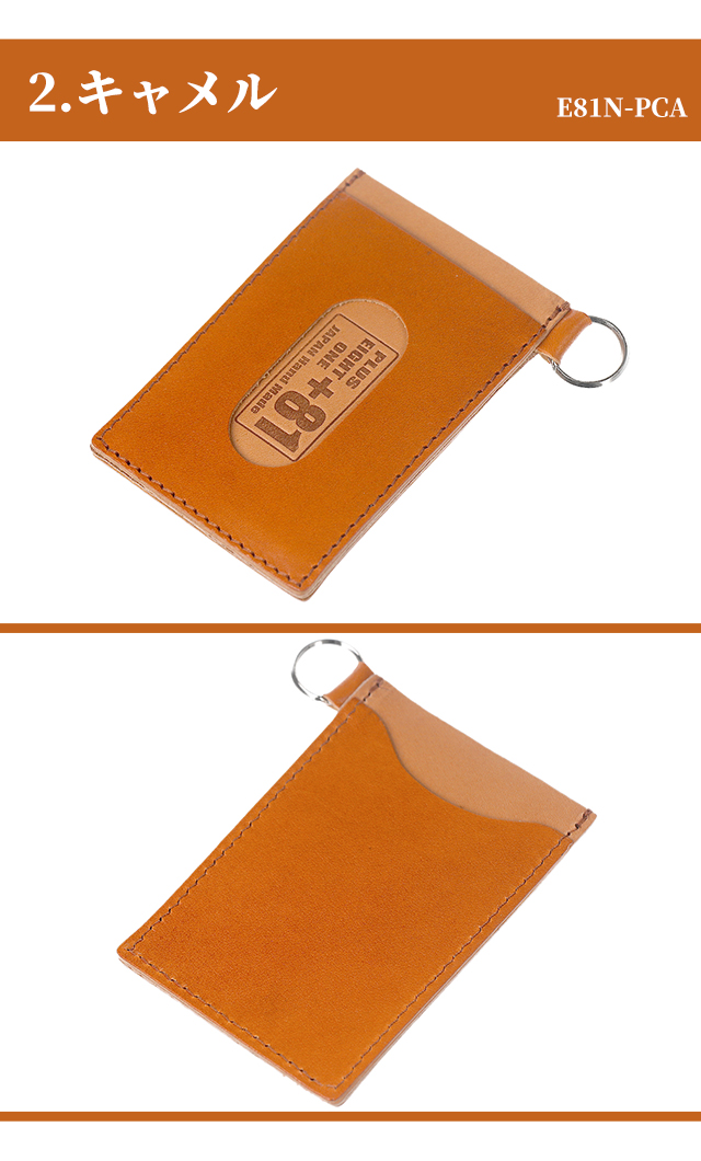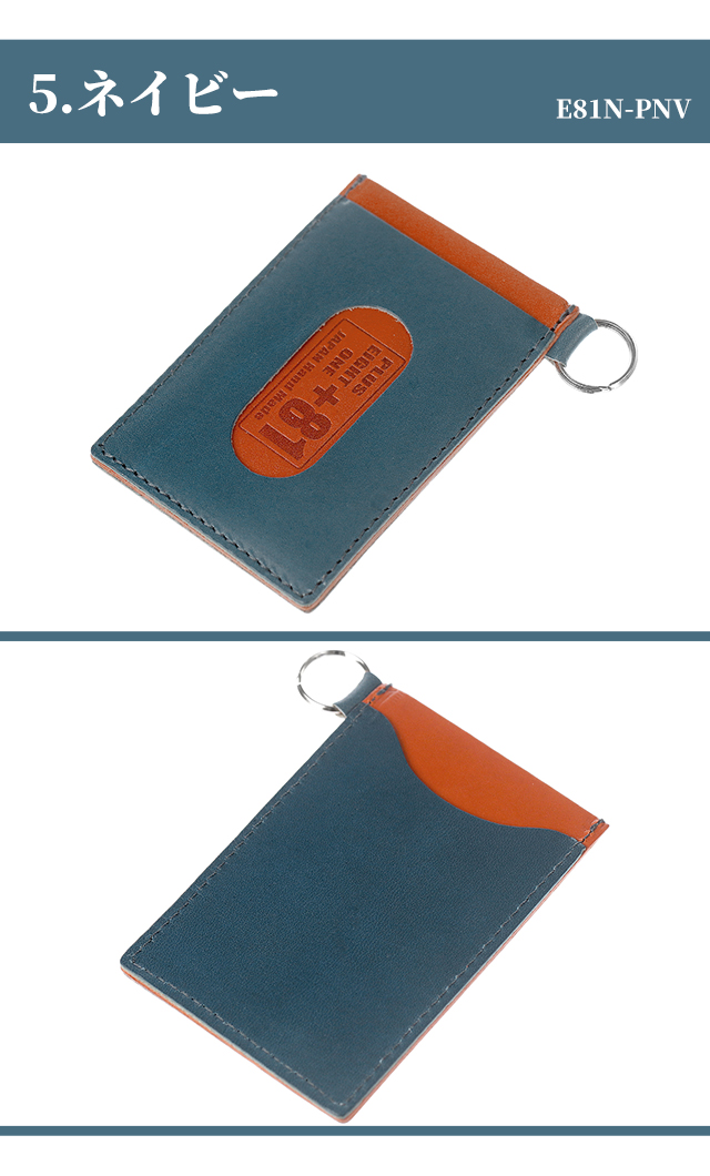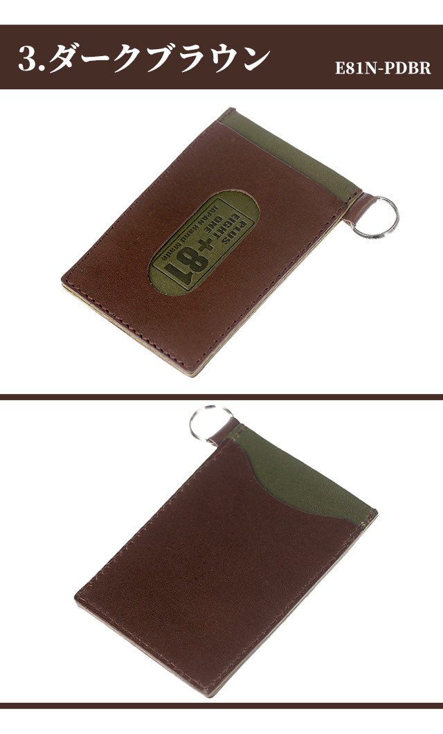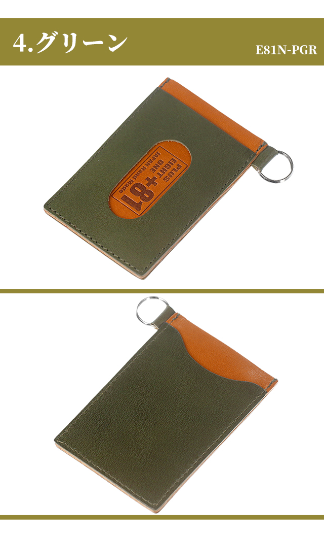 プラスエイトワン キーケース 小物 キーホルダー 鍵 100%栃木レザー メンズ +81 ◆PULUS EIGHT ONE (+81)は、日本の品質の良さをもっと多くの人に知っていただくために誕生しました。日本製に拘り熟練の職人さんが一つ一つ丁寧に製造しています。デザインから製造全ての工程を日本で行っていますので、Made In Japan のクオリティをお楽しみ下さい。 交通系カードやクレジットカードをタッチで使えます。中央のポケットには普段出し入れしないカードを入れると便利です。裁断から縫製まで全て日本製。お洒落なバイカラー。耐久性を計算しギリギリまで薄く軽くしています。 【1】ブラック E81N-PBK 【2】キャメル E81N-PCA 【3】ダークブラウン E81N-PDBR 【4】グリーン E81N-PGR 【5】ネイビー E81N-PNV