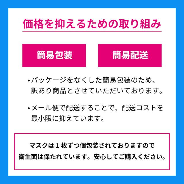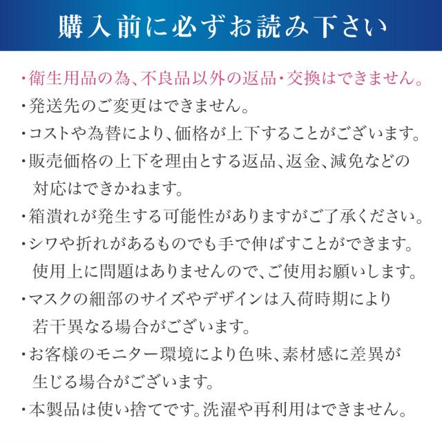 | 素材 | マスク本体:ポリプロピレン(不織布) 耳ひも:アクリル、ポリエステル ノーズフィッター:ポリエチレン |