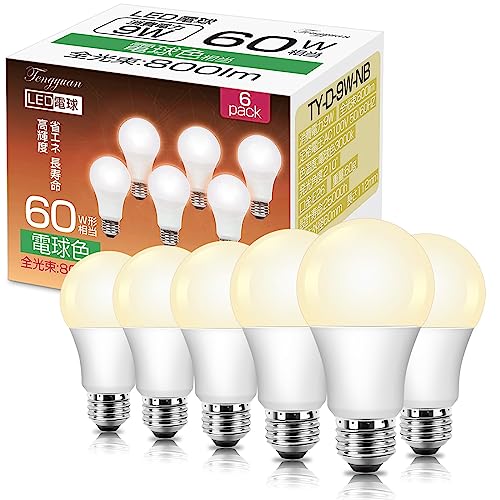 Tengyuan LED電球 E26口金 9W 60W形相当 電球色 3000K 800lm 広配光 高輝度 高演色性 省エネ 密閉形器具対応 断熱材施工器具対応 調光不可 【6個入り】