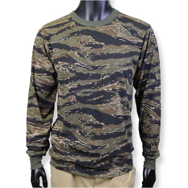 Tシャツ全体がタイガーストライプカモフラージュの迷彩柄の長袖Tシャツ。インナーとして、またアウターとしてもOKです。袖口は伸縮性があり、ずれにくくなっています