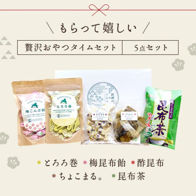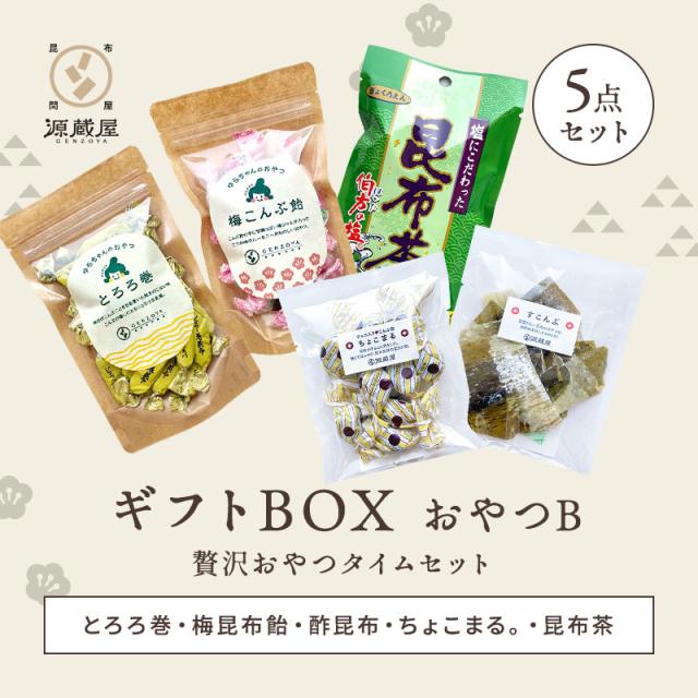 ギフトボックス おやつB 5点セット 【贅沢おやつタイムセット】 (とろろ巻・梅昆布飴・酢昆布・ちょこまる。・昆布茶(プレーン)) 送料無料 メッセージカード対応 agesugi_sgu