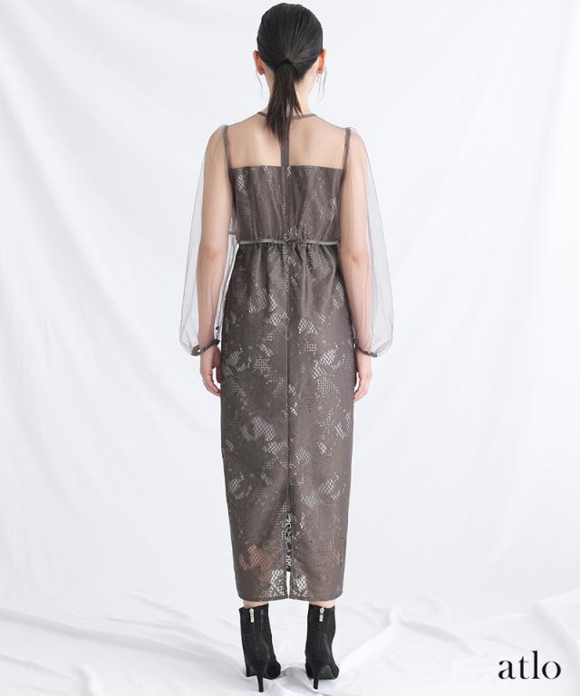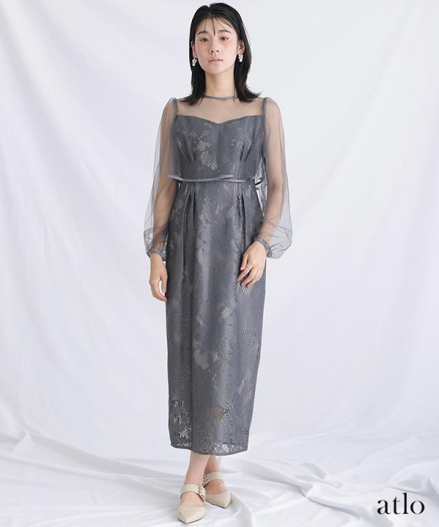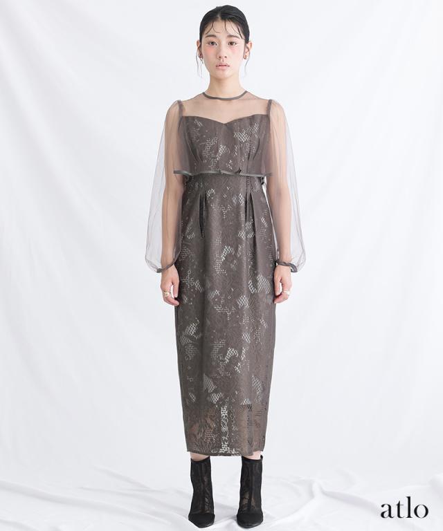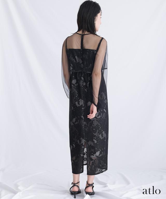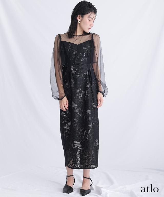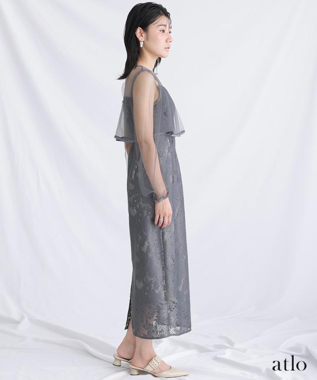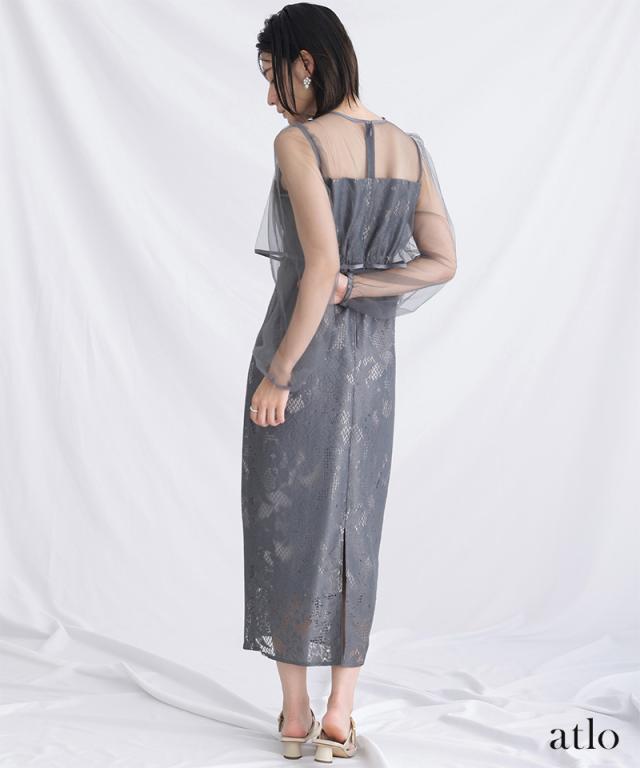 パイピングデザインのチュールを重ねたIラインワンピースです。