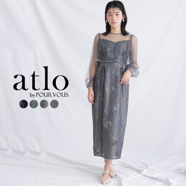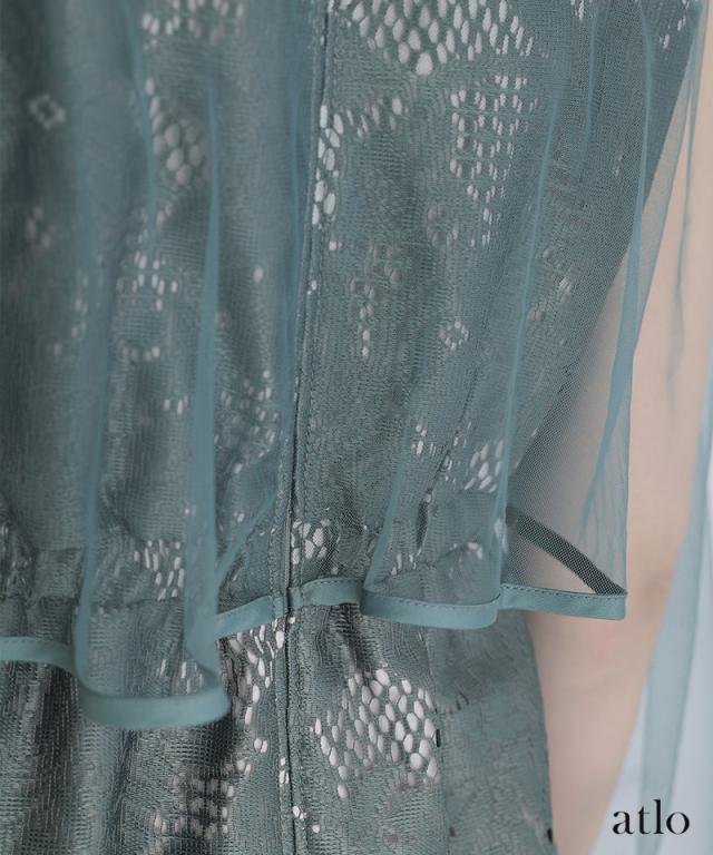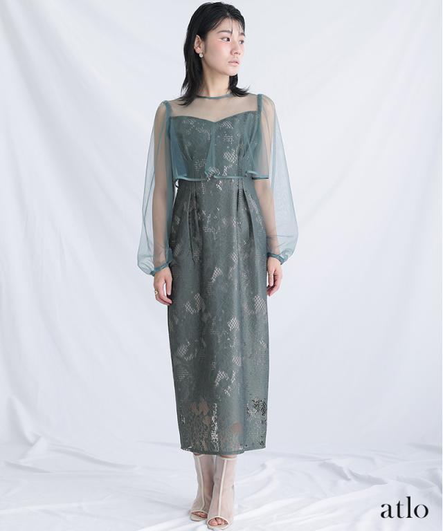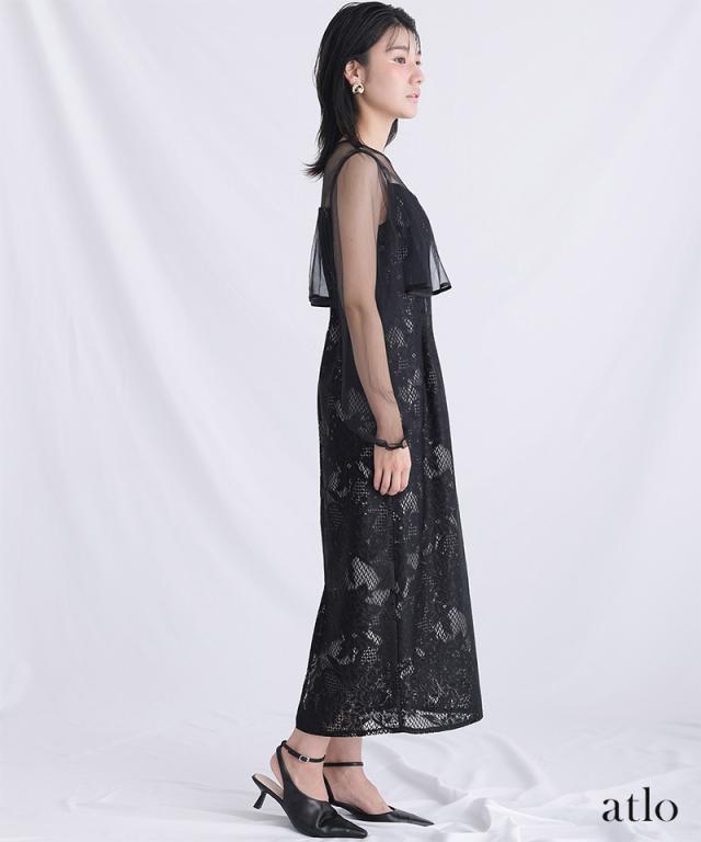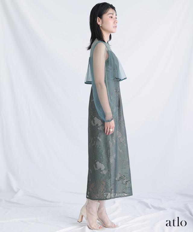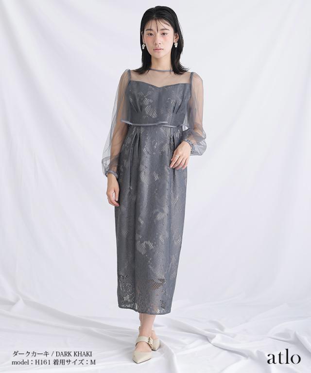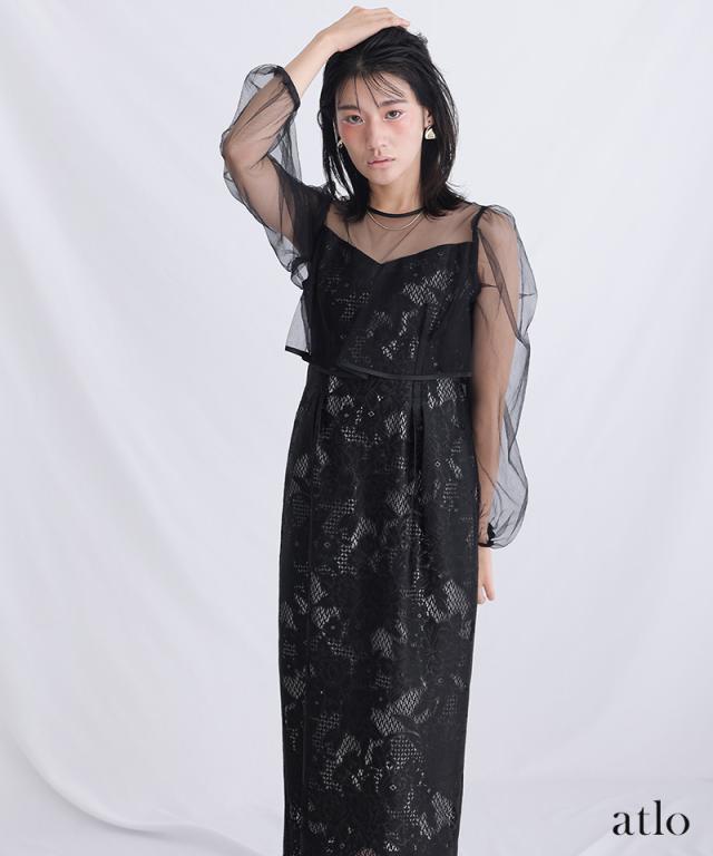 パイピングデザインのチュールを重ねたIラインワンピースです。