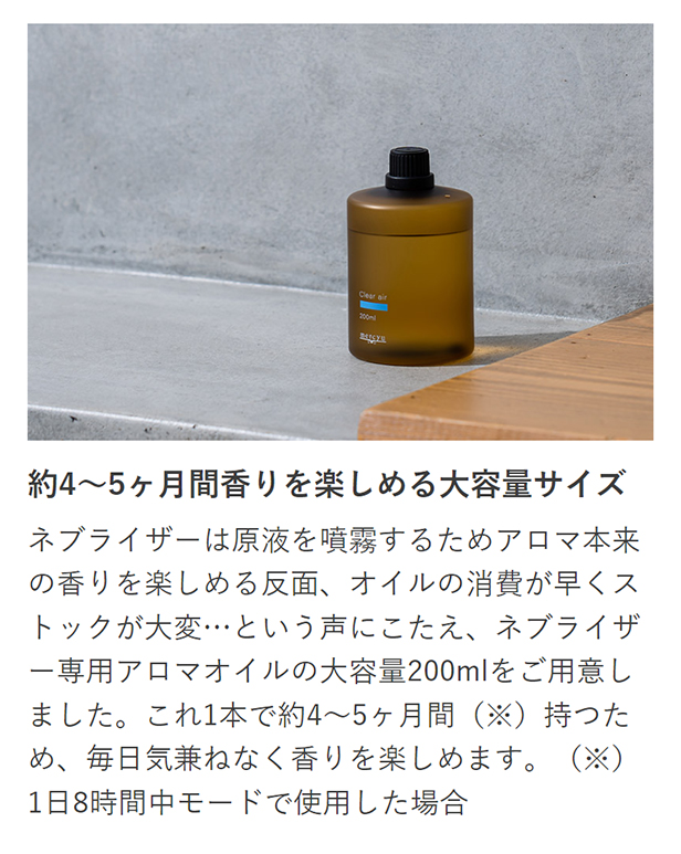 ネブライザー式ディフューザーで約4〜5ヶ月間(※)香りを楽しめる大容量のアロマオイル(※)1日8時間中モードで使用した場合