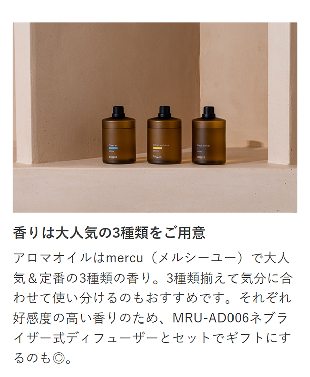 MRU-AD006ネブライザー式ディフューザー専用のアロマオイル。香りはmercyu(メルシーユー)で大人気の3種類をご用意しました。アロマオイルの消費が早いネブライザー式ディフューザーでも、約4〜5ヶ月間香りを楽しめる200mlの大変お得な大容量ボトルです。通常のアロマオイルとしても使用可能なため、お手持ちのアロマストーンやアロマパッドなど、あらゆるシーンで気兼ねなくお使いいただけます。スモーク処理を施した高級感あるボトルで、ネブライザー式ディフューザーに装着しライトをつけると、ボトルを通して柔らかに広がる明かりを楽しめます。