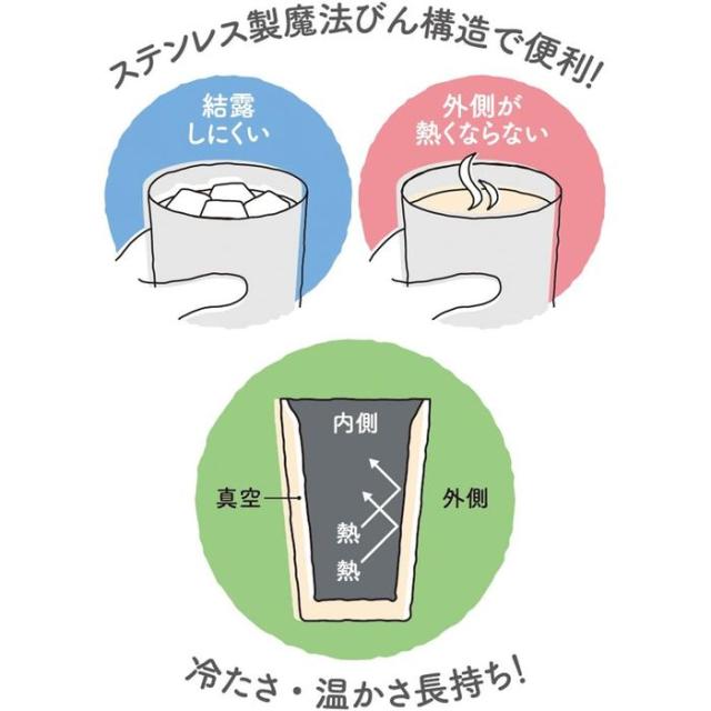 大人にも子供にも。使いやすいファミリー向けタンブラー。普段の食卓やリビングで。 ■手の小さい女性、子供にも持ち易い手になじむスリムな形状 ■保温に、保冷に。飲み頃温度で飲める ■氷が溶けにくいから味が薄まらない 【ステンレス魔法びん構造で便利】 ■結露しにくく、机を汚さない。コースターいらず ■熱い飲み物を入れても外側が熱くならない。