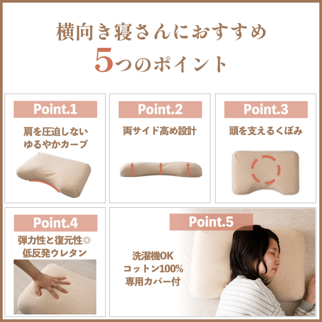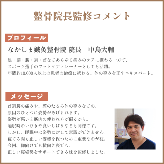 | ■横向き寝さんにオススメの整骨院長と考えた枕です。 ■ゆるやかなカーブ形状で、肩への圧迫を軽減します。 ■寝返りを楽にする両サイドを高めにした設計です。 ■枕中央には凹みがあり頭を安定させます。 ■弾力性と復元性のある低反発ウレタンを使用しています。 ■お肌に優しいコットン素材で洗濯機で丸洗い可能なカバー付き。 ■肩をしっかりサポートすることで、肩の凝りが軽減でき、良質な睡眠へ。 |