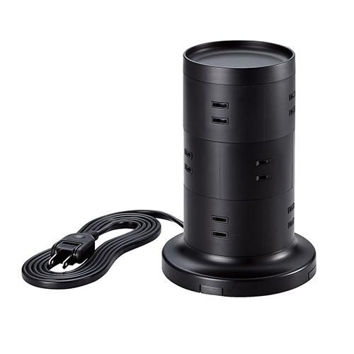 ■タワー型のため、差込口が多くても小さな面積で設置でき、360度あらゆる方向から接続できるので、会議室のデスクなどでの使用に便利です。