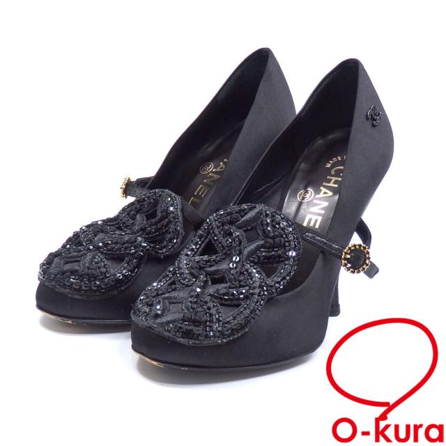 中古 シャネル パンプス レディース ラウンドトゥ ハイヒール サテン ビーズ ビジュー ブラック 黒 21.5cm 34 1/2 ココマーク 古着