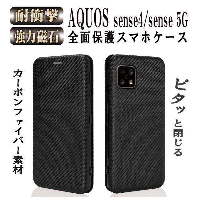 AQUOS(アクオス) sense4/sense 5G スマホ ケース カバー 手帳型 薄型 炭素繊維カバー 耐衝撃 強力マグネット カード収納 落下防止リング 全面保護 かっこいい おしゃれ センス 4