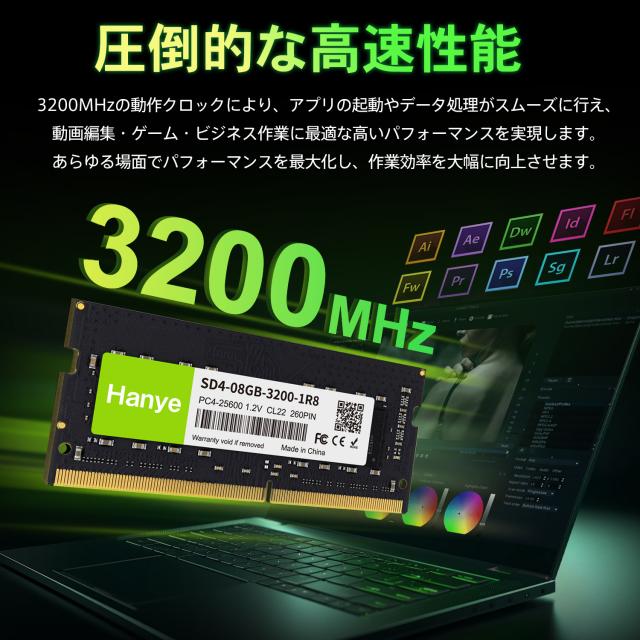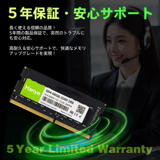 ノートPC用メモリ PC4-25600(DDR4-3200) 8GB SODIMM Hanye 1.2V CL22 260pin SD4-08GB-3200-1R8 国内正規代理店品 5年保証 ネコポス送料無料 ポイント消化