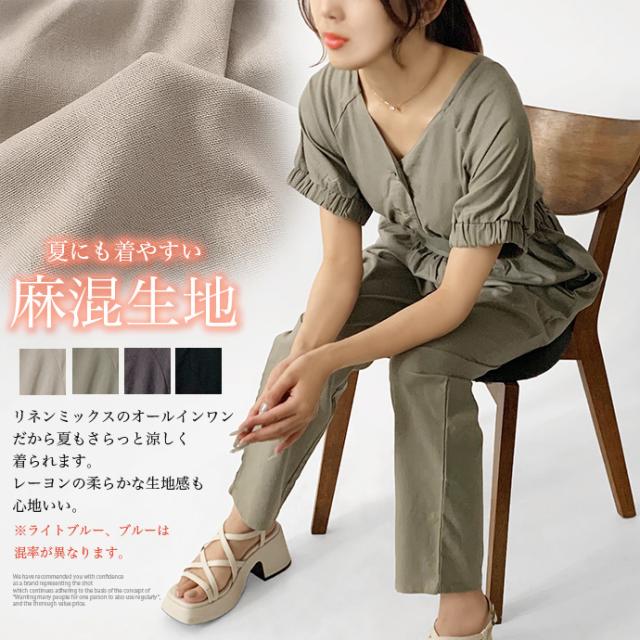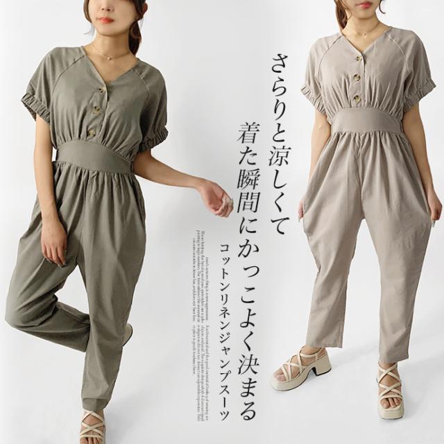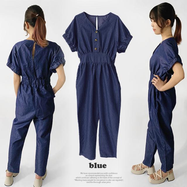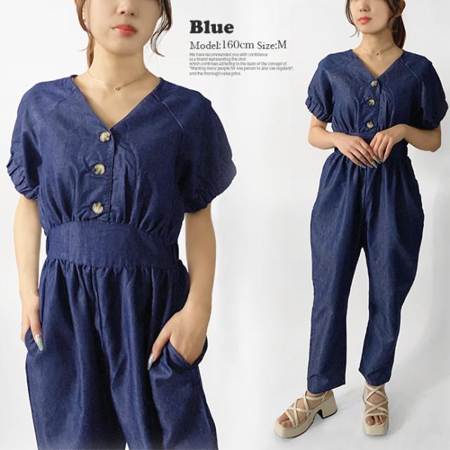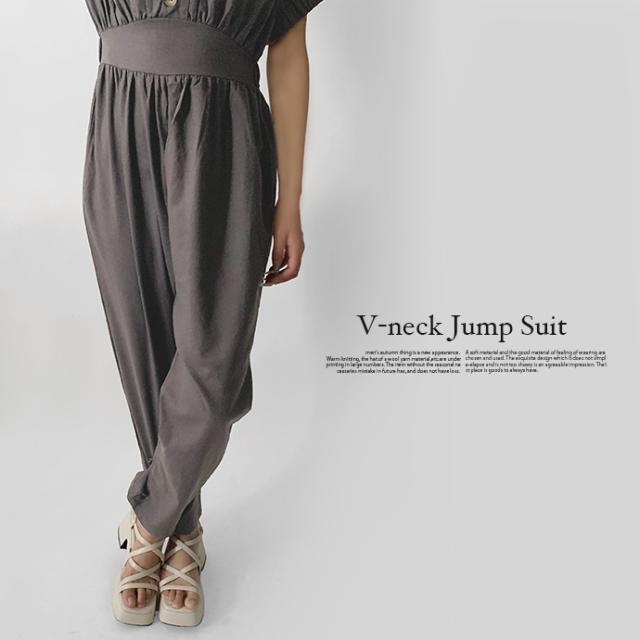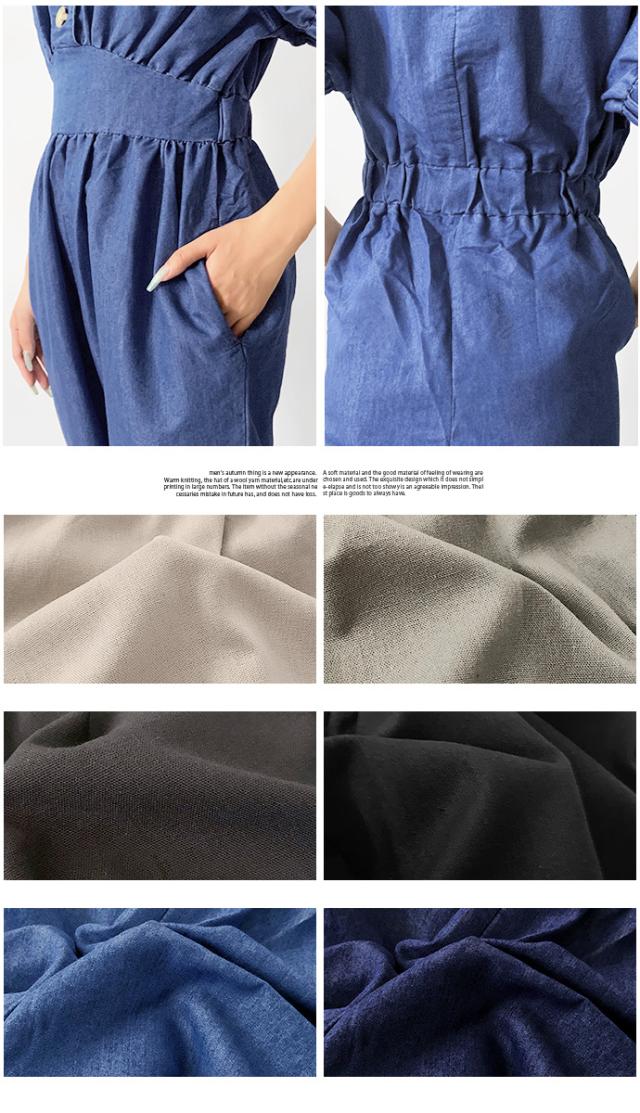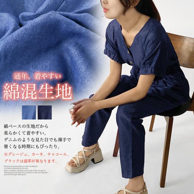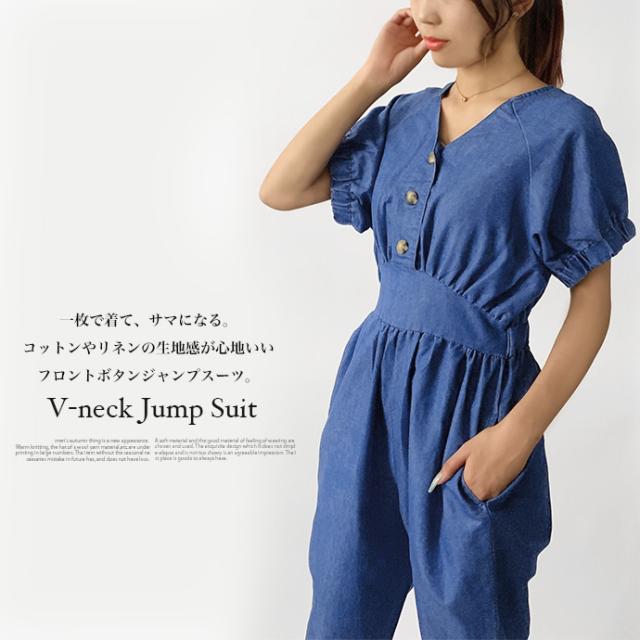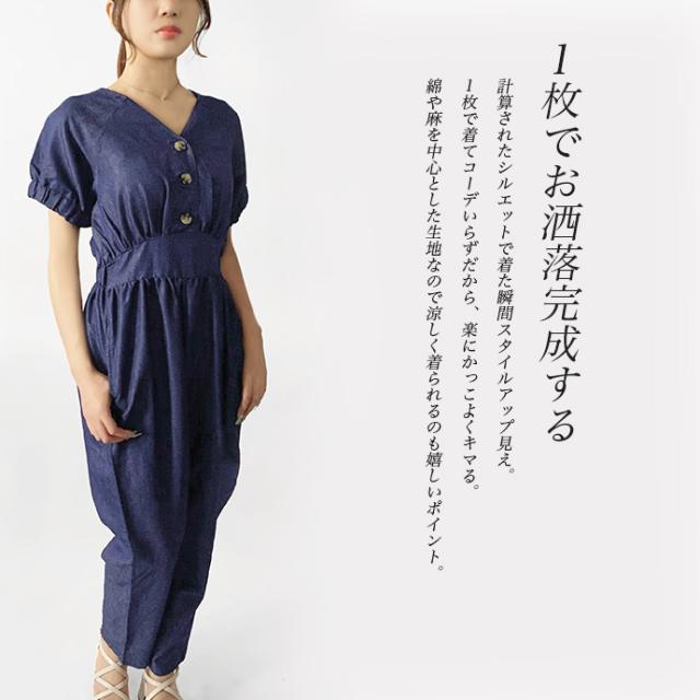 オールインワン ボトムス パンツ サロペット ロング ジャンプスーツ ゆったり 無地 Vネック カジュアル シンプル コットン リネン 無地 デニム風生地 レディース 送料無料