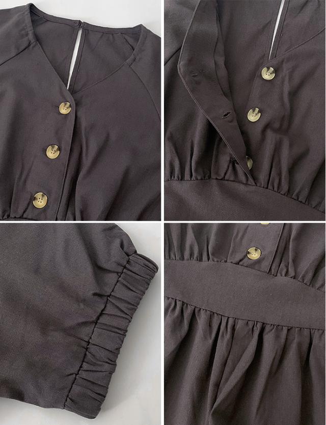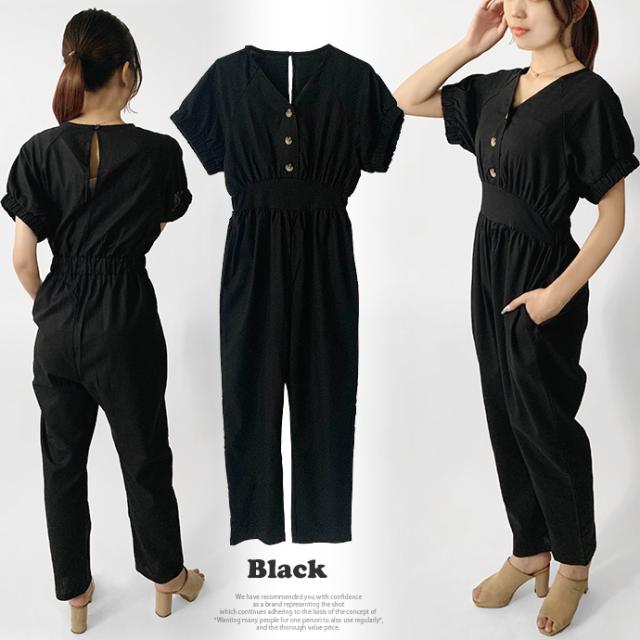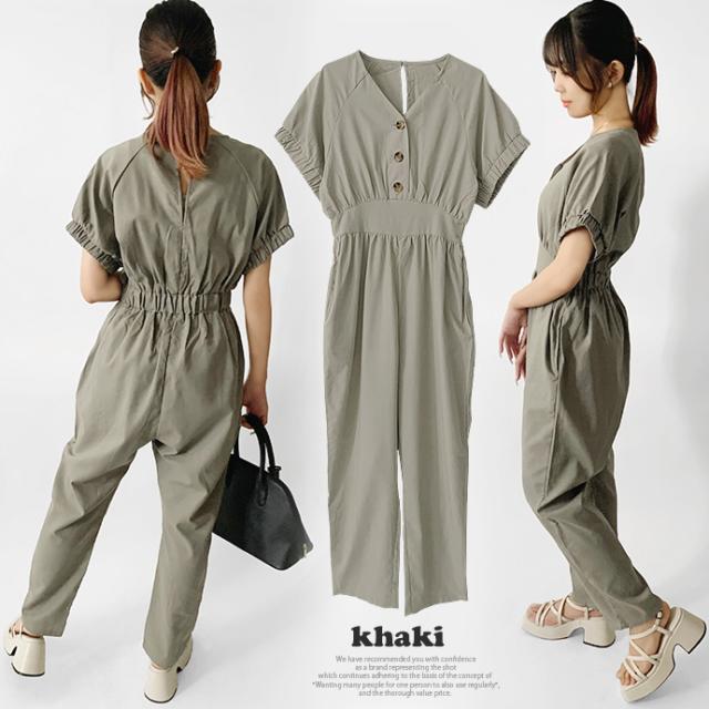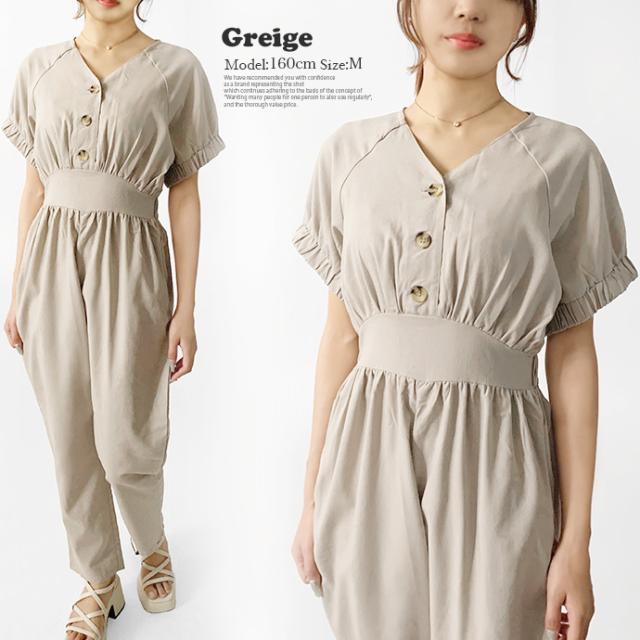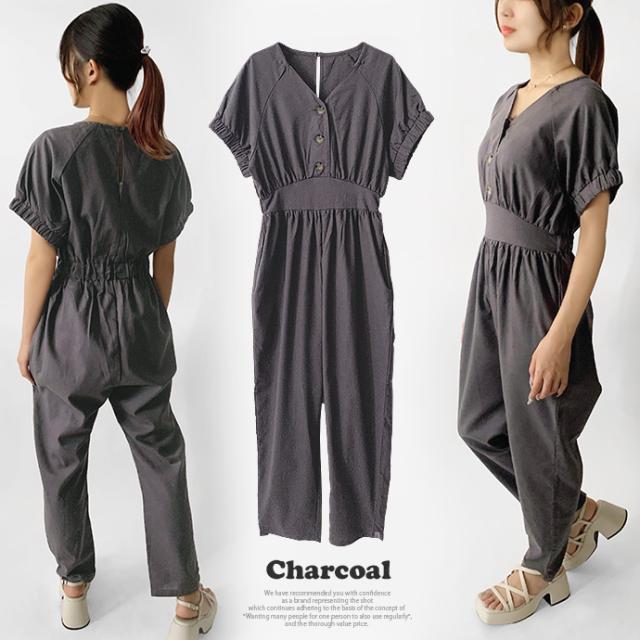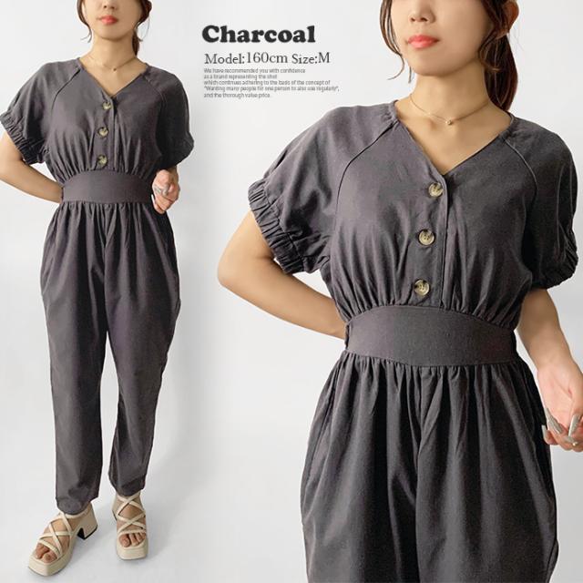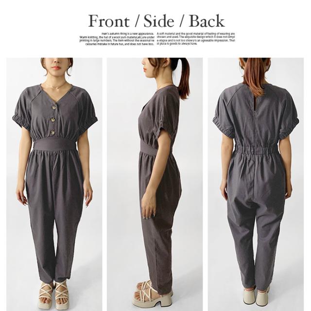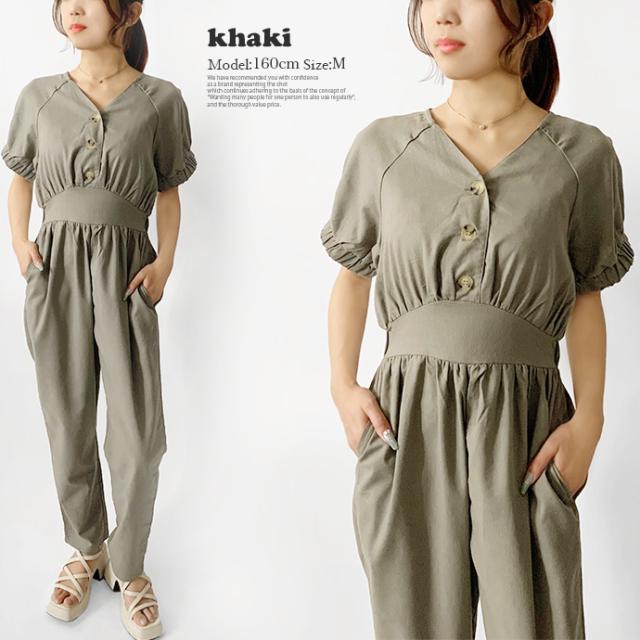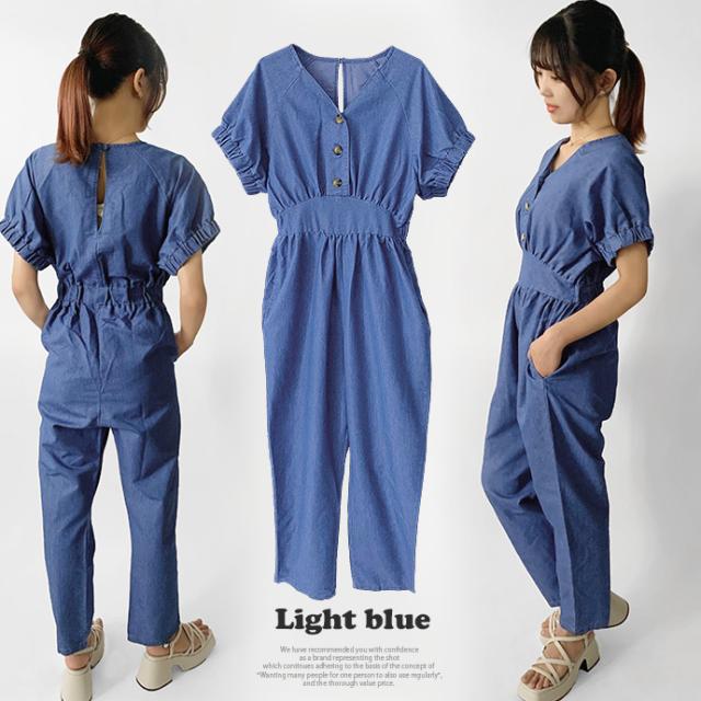 オールインワン ボトムス パンツ サロペット ロング ジャンプスーツ ゆったり 無地 Vネック カジュアル シンプル コットン リネン 無地 デニム風生地 レディース 送料無料