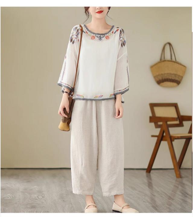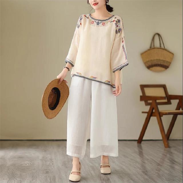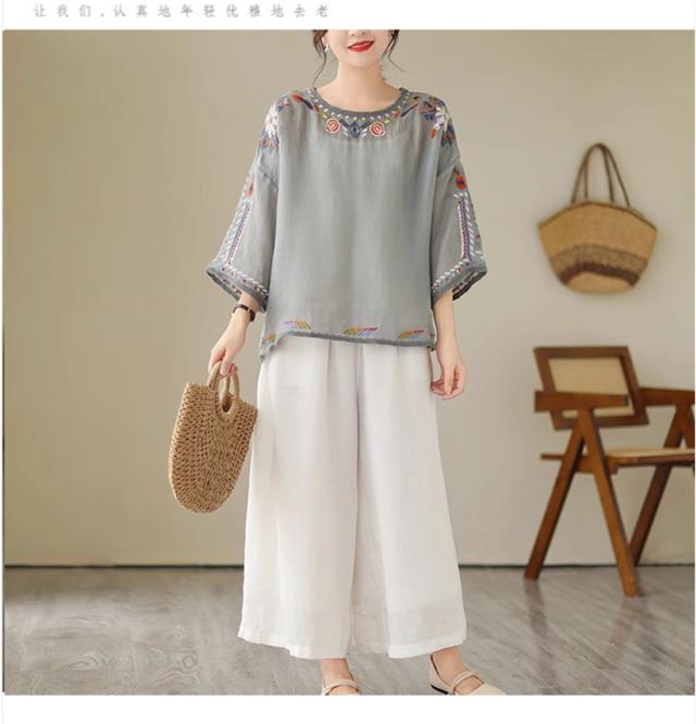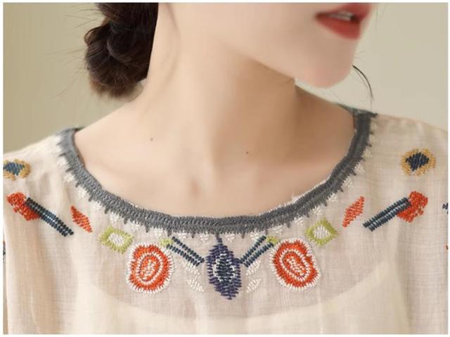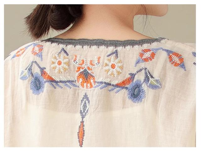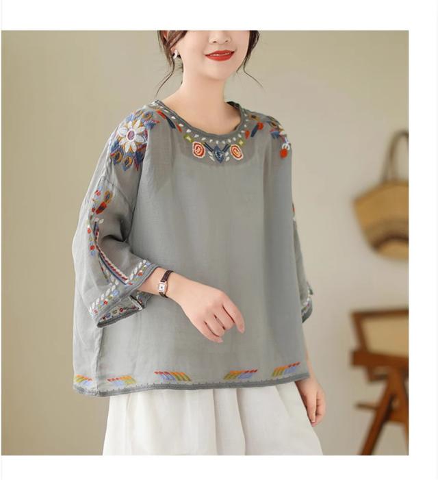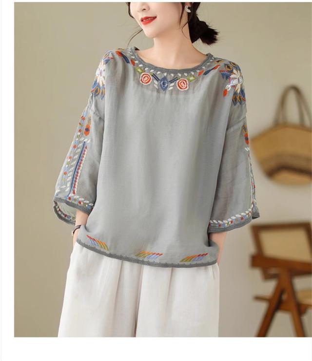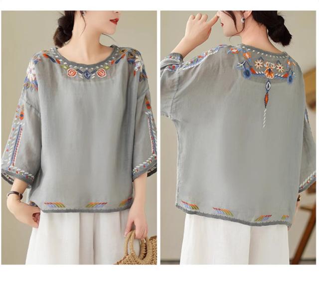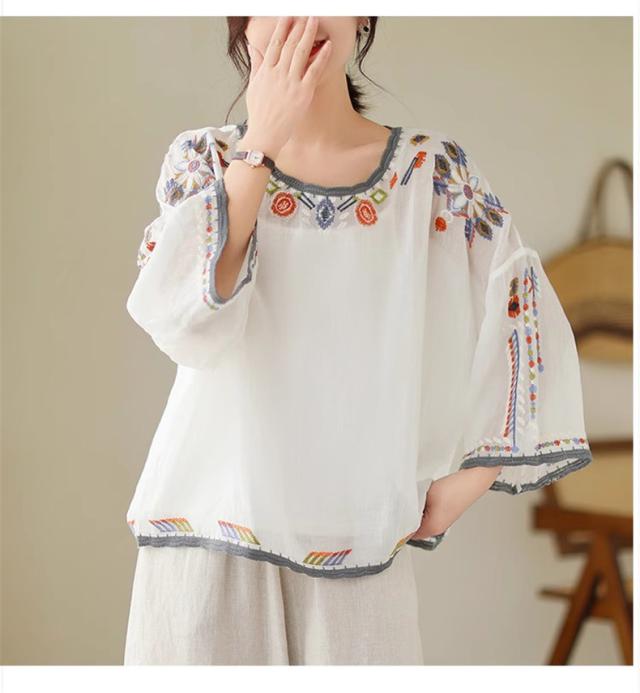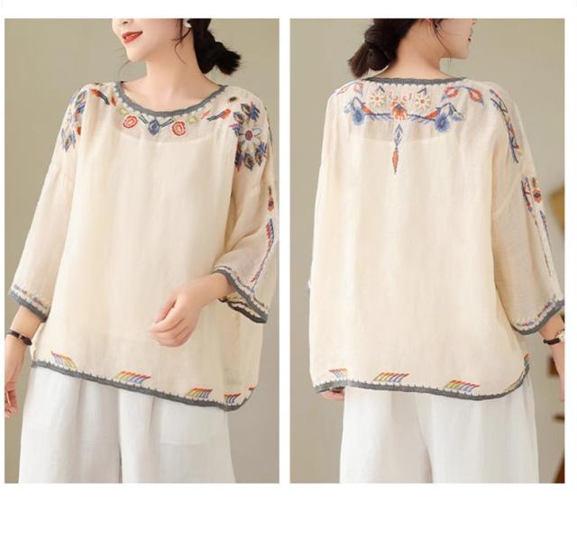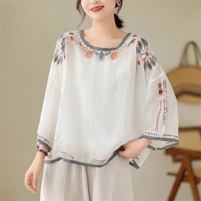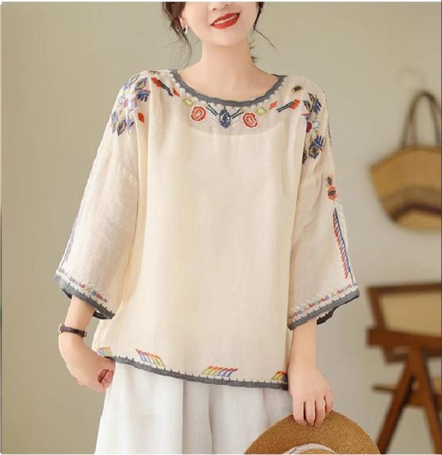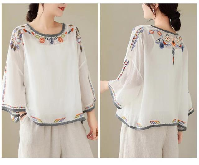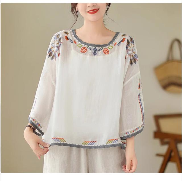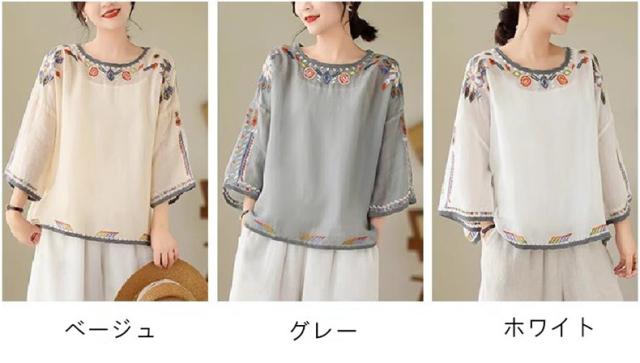 夏ブラウス レディース 夏トップス シャツ 七分袖 刺繍 花柄 ふんわりと キレイなシルエットに仕上げ 上品ながらも