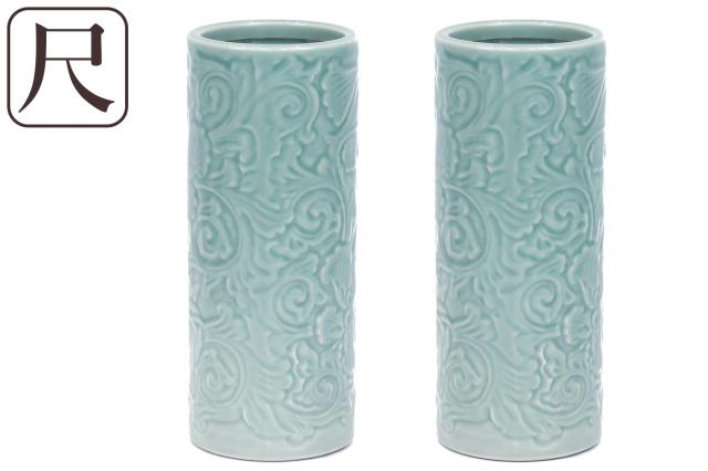 花立 墓 お墓 花立て 仏具 陶器 花瓶 2本組 セット 青磁 唐草 投入 尺 寸胴 (代引き決済不可商品)