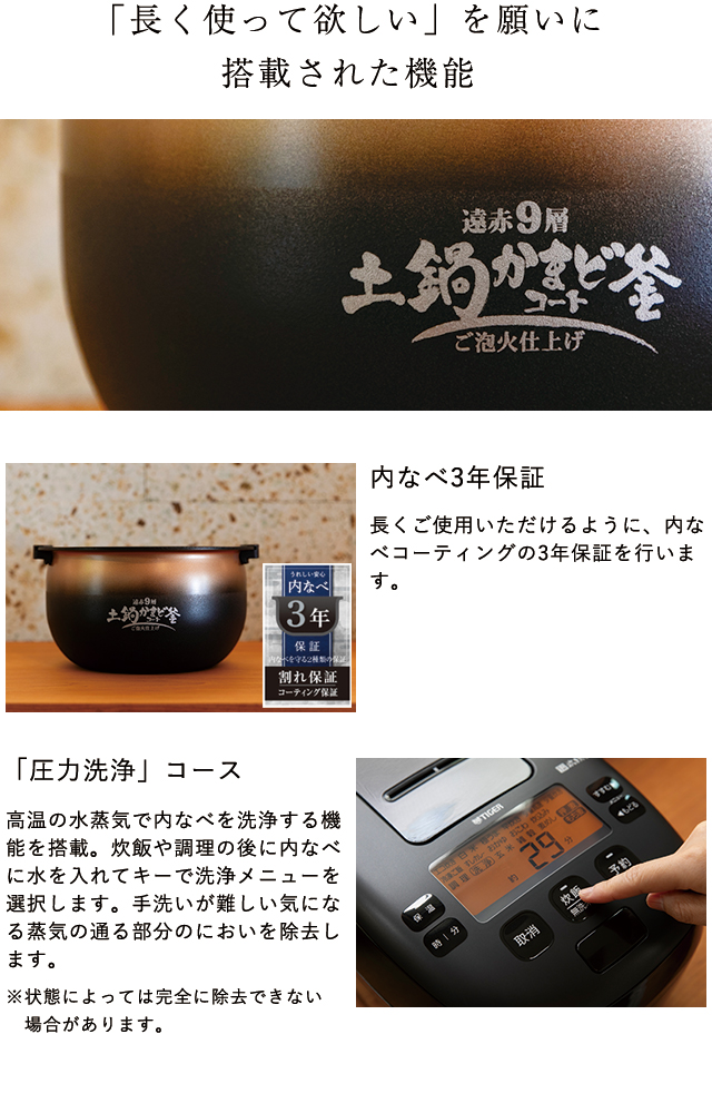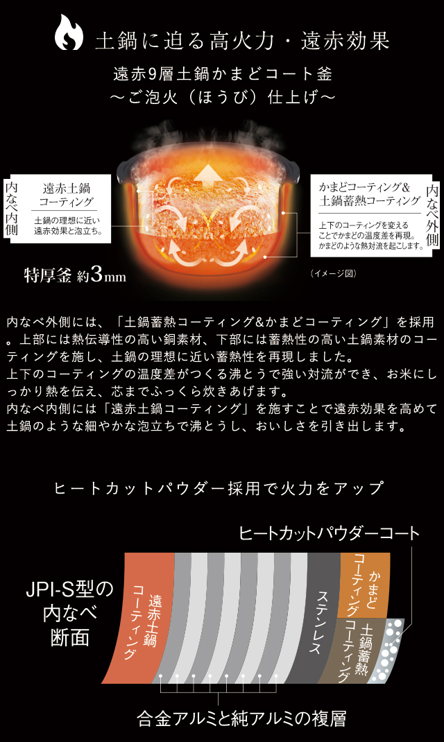 内なべ:土鍋かまどコート釜、遠赤9層厚釜(なべ厚最大3mm)、内なべ洗米OK、内なべとっ手つき、内なべ3年保証