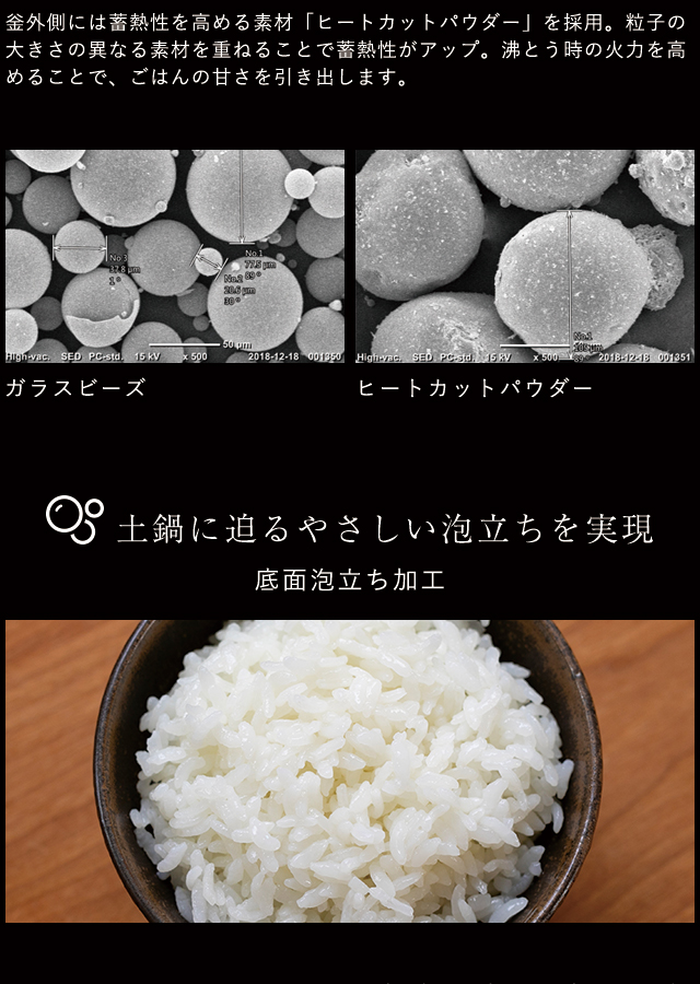 内なべ外側には、「土鍋蓄熱コーティング&かまどコーティング」を採用。上部には熱伝導性の高い銅素材、下部には蓄熱性の高い土鍋素材のコーティングを施し、土鍋の理想に近い蓄熱性を再現しました。