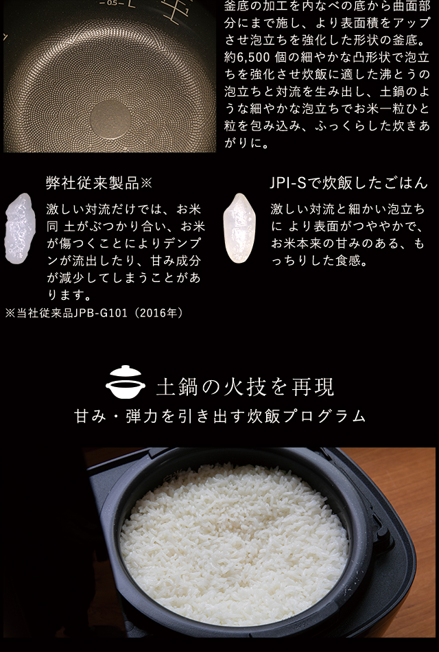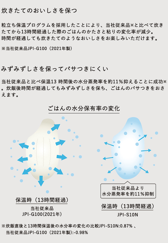 保温時にも蒸気センサーを活用することで、 ごはんから出る蒸発水量を感知して昇温温度を管理し、蒸発水量をベストな状態で保つため、水分をごはんにとどめお米の輪郭を保ったままふっくら保温します。