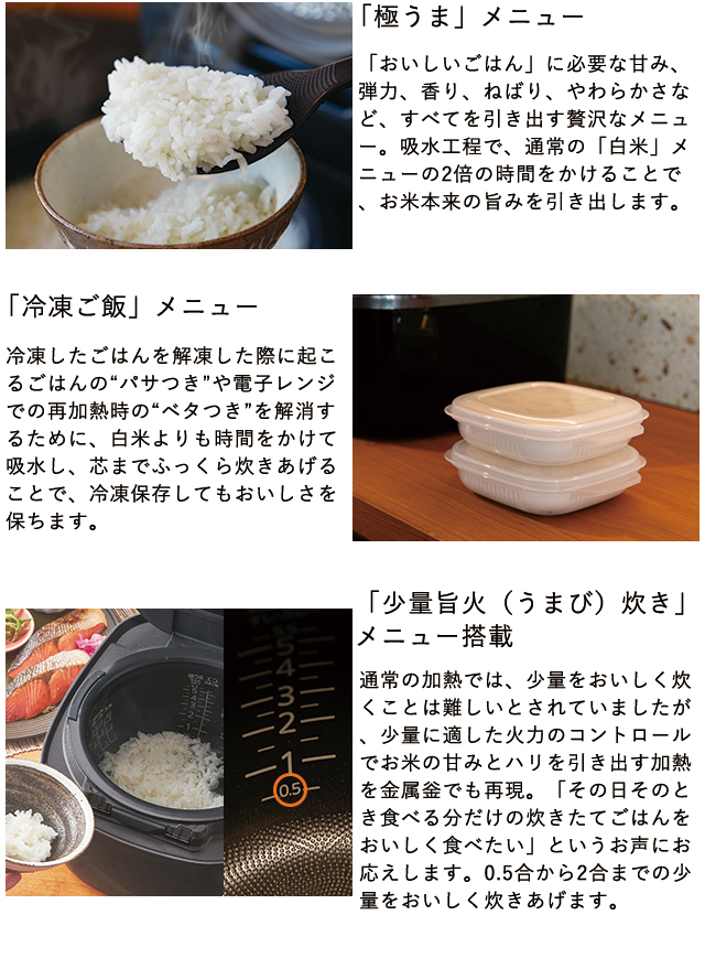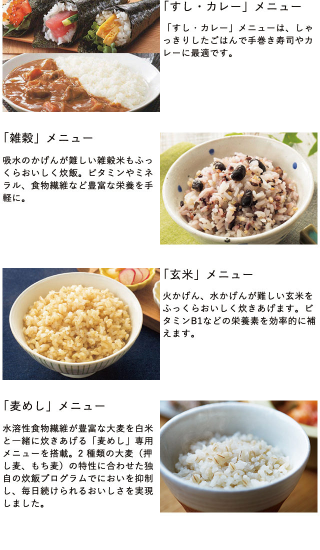 エコ炊き*・白米*・極うま*・少量旨火炊き*・早炊き*・少量高速*・冷凍ご飯*・すし*・カレー*・炊込み*(おこげ選択)・おかゆ*・玄米・雑穀米*・麦めし押麦*・麦めしもち麦*・おこわ・調理